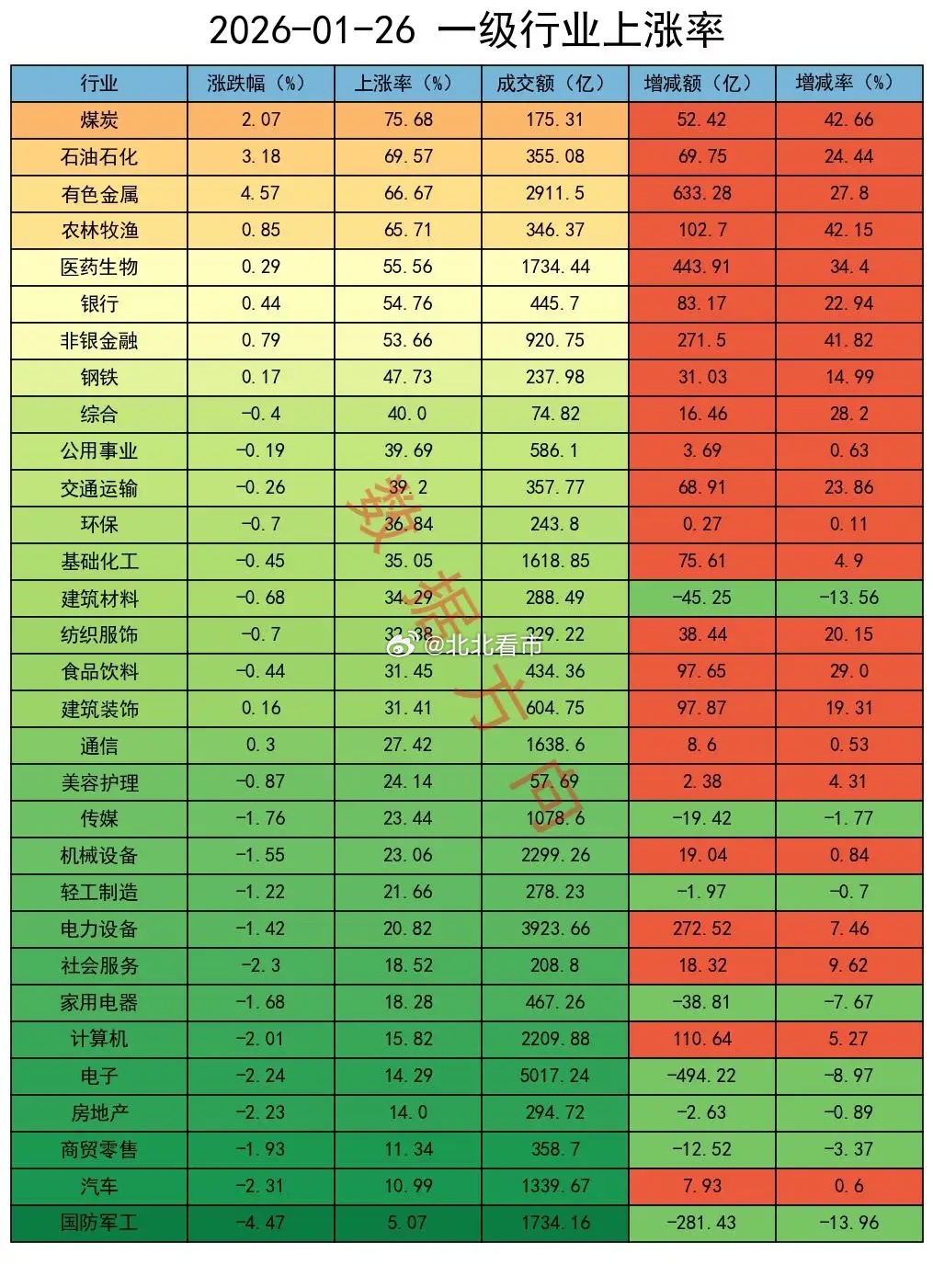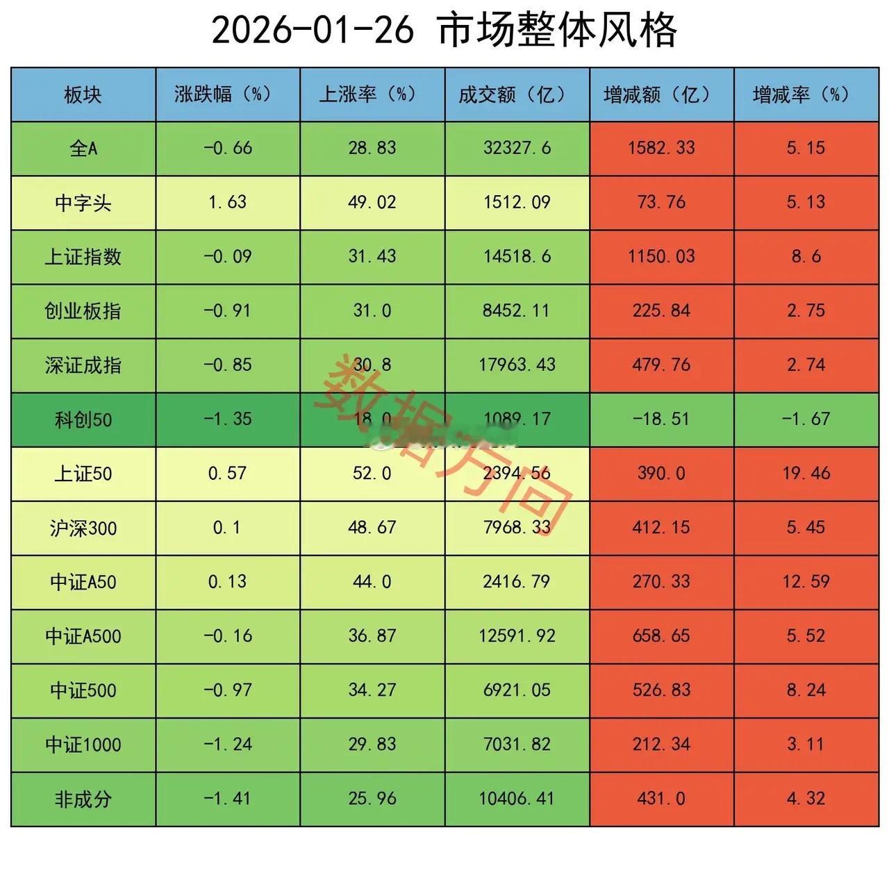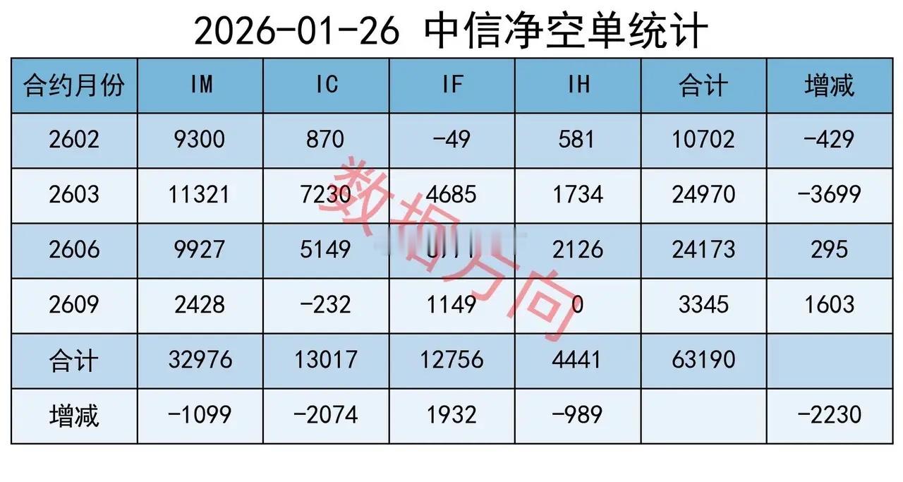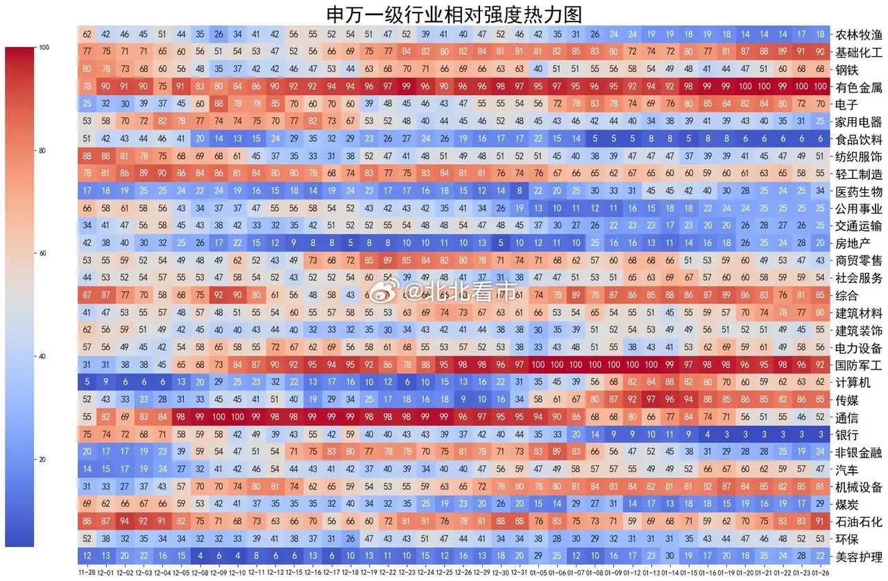 资源股集体躁动,机构减空大盘放量整理,全A指数跌幅0.66%,有色金属、油气、煤炭等资源类涨幅居前,商业航天、AI应用、消费电子等跌幅居前,个股上涨率29%,成交额较上周五增加5%。上周的盘面,中小盘股普涨,大蓝筹以下跌为主。今天的盘面风格大变,大盘股转为涨、中小盘股普跌。中字头,涨幅1.63%,在所有宽指中遥遥领先,略显突兀。上证50、中证A50、沪深300等代表大盘蓝筹股的指数也全都上涨。代表微、小盘股的非成分、科创50、中证1000,跌幅分别为1.41%、1.35%和1.24%,占据了指数跌幅的前三名;代表中盘股的中证500,跌幅为0.97%。从复盘数据看,机构们采取了减空的操作。行业煤炭、石油石化、有色金属、钢铁、公用事业,一起进入榜单前10名,基础化工位于榜单第12位大宗商品全线走强。尤其是有色金属板块大涨4.57%。黄金、白银双双刷新历史高点。现货白银日内涨幅超5%,向上突破108美元关口;现货黄金日内涨超2.3%,站上5100美元。从而带动整个有色金属板块全线走强。受地缘政治、美元指数快速走弱等因素影响,导致避险资金优先配置黄金,从而推动金价持续刷新高位。高盛将黄金今年底目标价从每盎司4900美元上调至5400美元,理由是私人部门投资者和中央银行对黄金的需求不断增长。老美首先对委内瑞拉动手,然后把航母打击群部署到波斯湾,目前又开始考虑对古巴的石油进口实施全面封锁。上周五,国际油价大涨,WTI原油、ICE布油均涨超3%。热力图本图用于观察市场整体强度结构。每个小格子代表某个行业在当天的强度,数值介于0-100之间,大于50者说明强于市场基准,用红色表示。有色金属(100)、国防军工(92)、石油石化(91)、基础化工(90),是当前最强的4个行业,并且其中3个都属于大宗商品。今天过完以后:大宗商品的平均强度为67;科技方向的平均强度为67;高端制造方向的平均强度为60。期指持仓某信,减空2230手;对IF加空1932手,分别对IH、IC、IM减空989手、2074手、1099手;加仓买单11127手,加仓卖单8897手。其他主要玩家,减空1883手;对IH加空1917手,分别对IF、IC、IM减空440手、524手、2836手;加仓买单29642手,加仓卖单27759手。大盘震荡整理,盘面风格发生变化,大盘股涨,中小盘股跌。两者合计减空4113手,只看今天是较好的信号。合计对IH、IF加空2420手,合计对 IC、IM减空6533手两者因为昨天持有的157584手净空单,会在今天的行情中获利17亿,可以对冲股票回撤带来的部分损失。操作完成后,共持有净空单153471手,仍然是非常大的数据。散户缺少对冲的手段,看到净空单非常大的时候,只能通过仓控来保护自己;看到净空单减下去以后,再考虑加码的事情。
