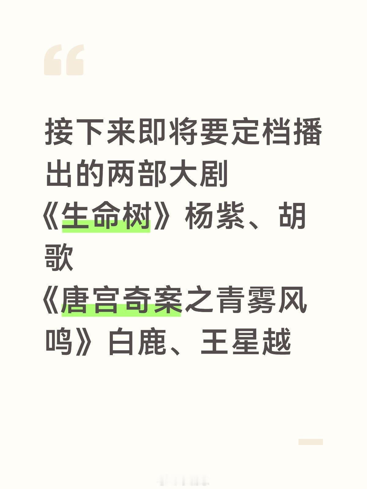 接下来即将要定档播出的两部大剧《生命树》杨紫、胡歌《唐宫奇案之青雾风鸣》白鹿、王星越