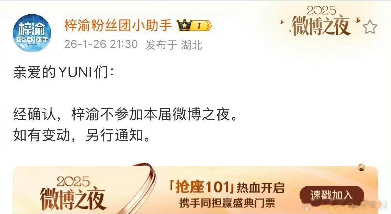 梓渝、田栩宁都不参加本届微博之夜。