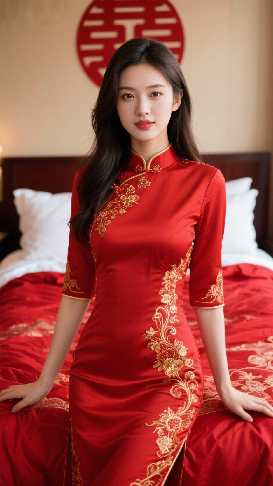 《红襟裹着吉柔》 暖室里的红意轻漫时,她立在柔光中抬眸。墨发舒展垂落,发梢沾着软暖的气息,身后“囍”字晕开温煦的红。 正红襟衫绣着金枝花影,缎面浸了柔润的光,像把吉意织进衣料里。指尖轻落床沿,她眉目间裹着舒展的软,连周遭空气都沾了妥帖的暖。 襟上金纹随轻呼吸微晃,恍惚间,这一瞬的吉庆被光揉进日常,叫人想把这份红意里的温软,妥帖收进时光的余韵中。 红襟吉柔感 中式衣装雅