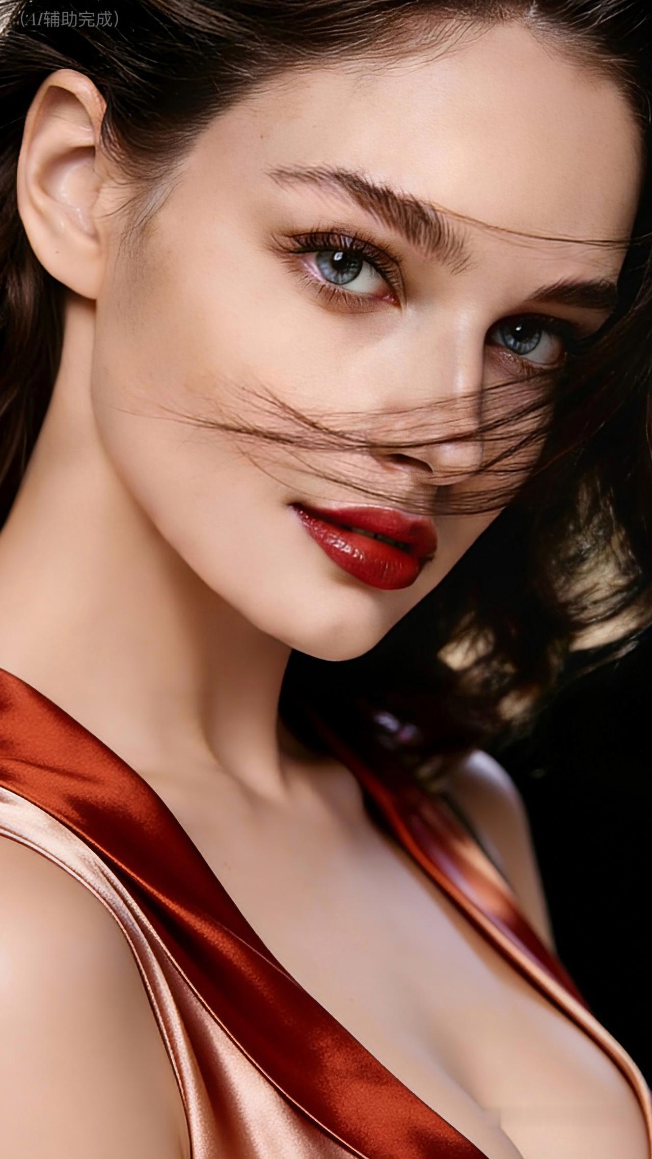 九帧皆燃火焰卷发,红棕流金泛柔光。黑衣露肩颈,眉眼含笑眸藏星,甜笑绽光气质雅。暗
