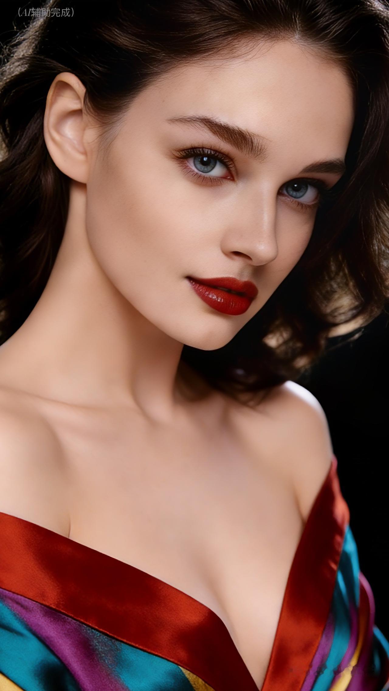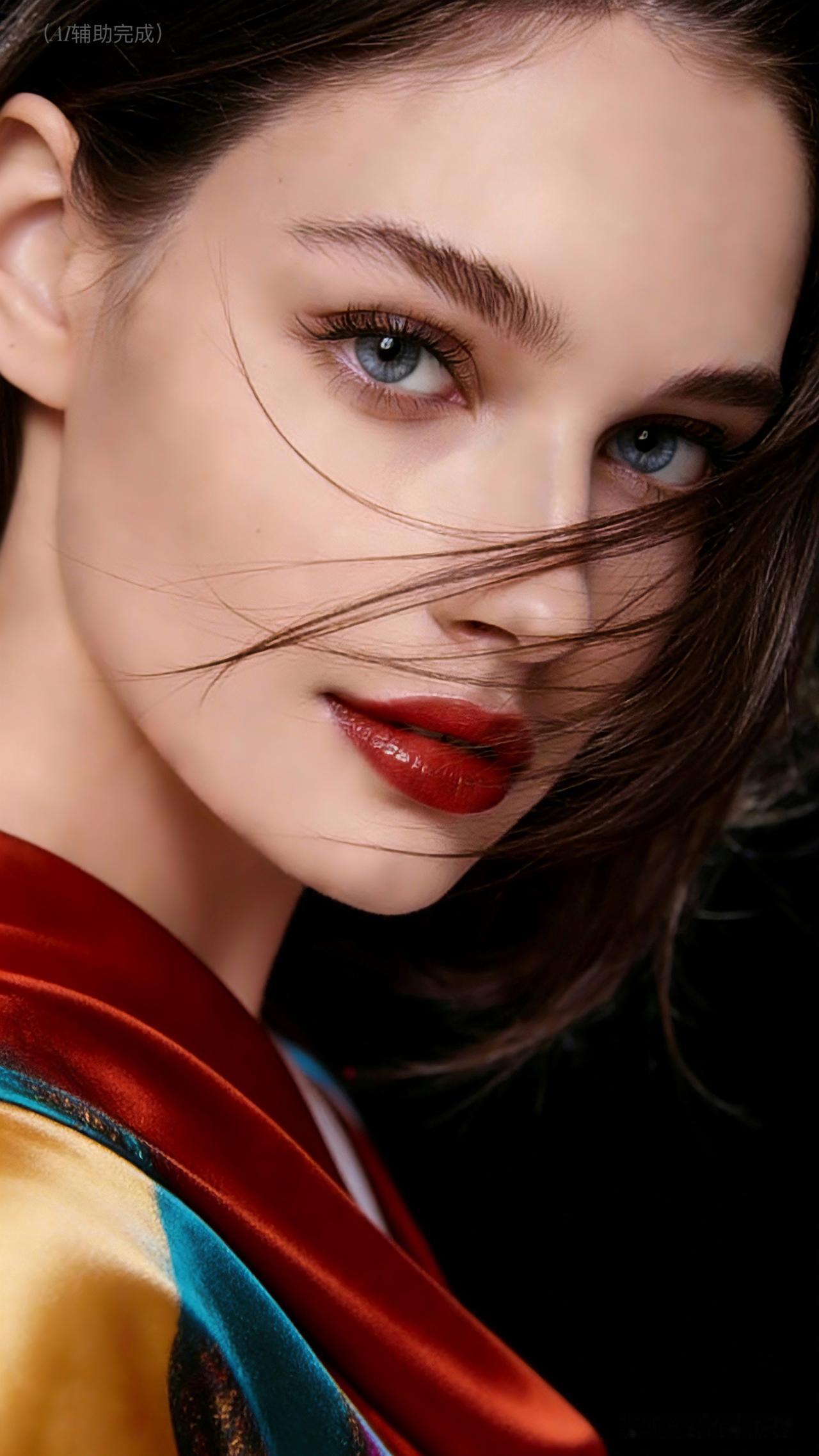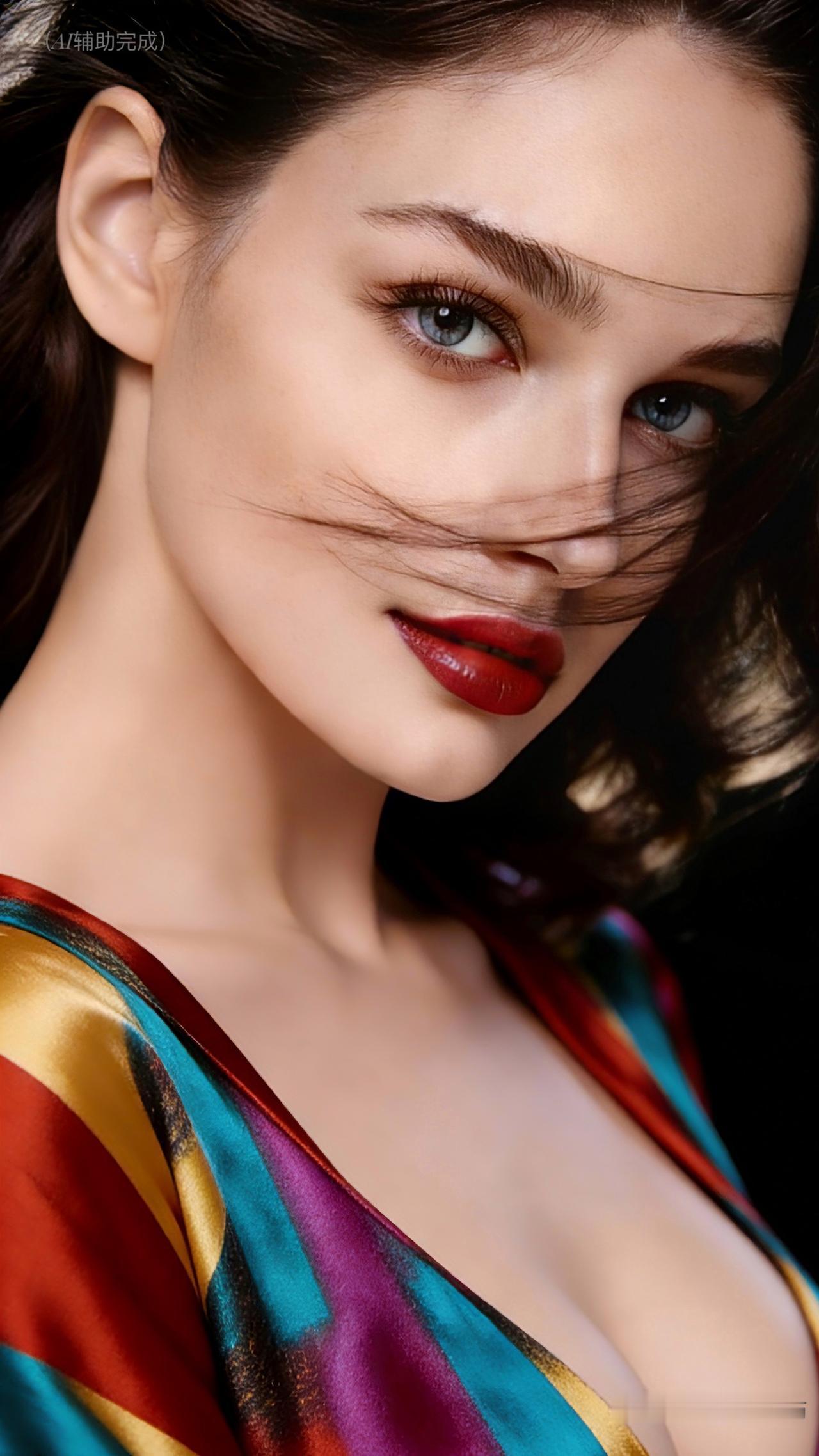 九帧同绘高贵仙。乌发卷浪蓝眸藏星,红唇点绛似焰燃。丝衣流彩(红蓝黄金紫)光泽柔裹