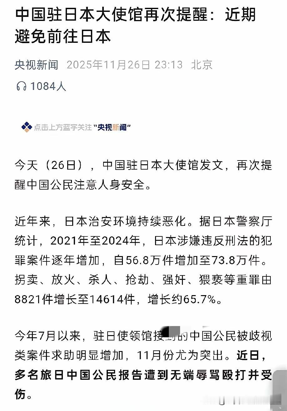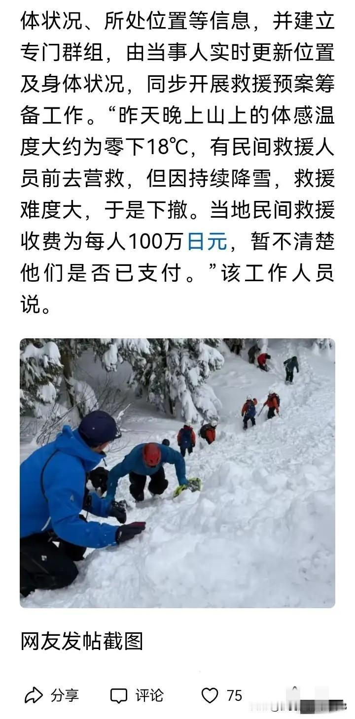 外交部和驻日大使馆都已发出提醒:春节期间尽量别去日本旅游,而且已有49条航班停飞。为何还有人这般执拗,非要前往! 1月25日,六名中国游客在日本滑雪时遭遇险情。在零下18度的环境中被困长达20小时,好在驻日使馆从中协调。最终他们被民间救援队救出,据说每人的救援费用高达100万日元! 真是好言难劝头铁的人,这些人实在不值得同情!