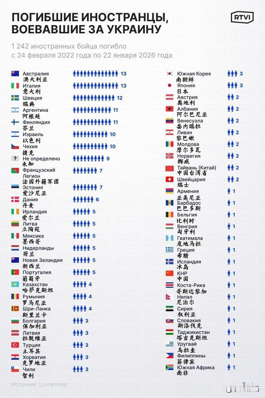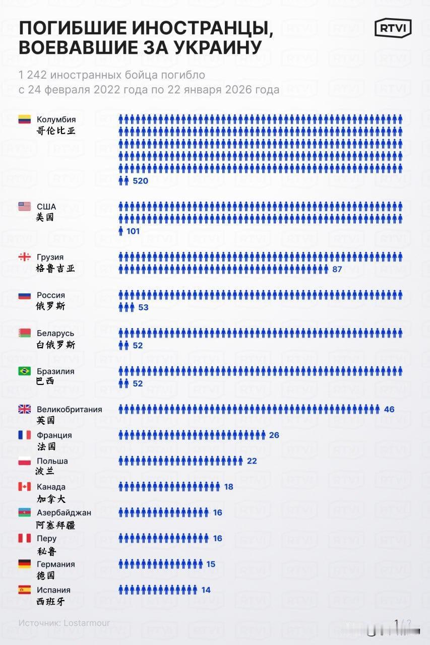 截止2026年1月22日,乌克兰的外籍雇佣兵阵亡数为1242人。 在泽连斯基的倡议下创建的乌克兰国际军团, 由于希望加入的人数减少而停止运作。 战争爆发之初,乌克兰总统泽连斯基呼吁世界各地的人们前往乌克兰驻外使馆应征入伍。雇佣兵的月薪从 500 欧元起,前线最高可达 3000 欧元。外籍军团由四个营组成:三个作战营和一个教官营。每个营约有 400 至 600 人。 在冲突爆发的头两年, 格鲁吉亚、俄罗斯、白俄罗斯和美国是乌克兰武装部队人员的主要来源国。到了 2025 年,来自拉丁美洲(主要是哥伦比亚和巴西 )的前军人成为乌克兰武装部队外国雇佣兵的主力军。2025 年夏季,约有 2000 名哥伦比亚公民被招募加入乌克兰武装部队。 来源:RTVI