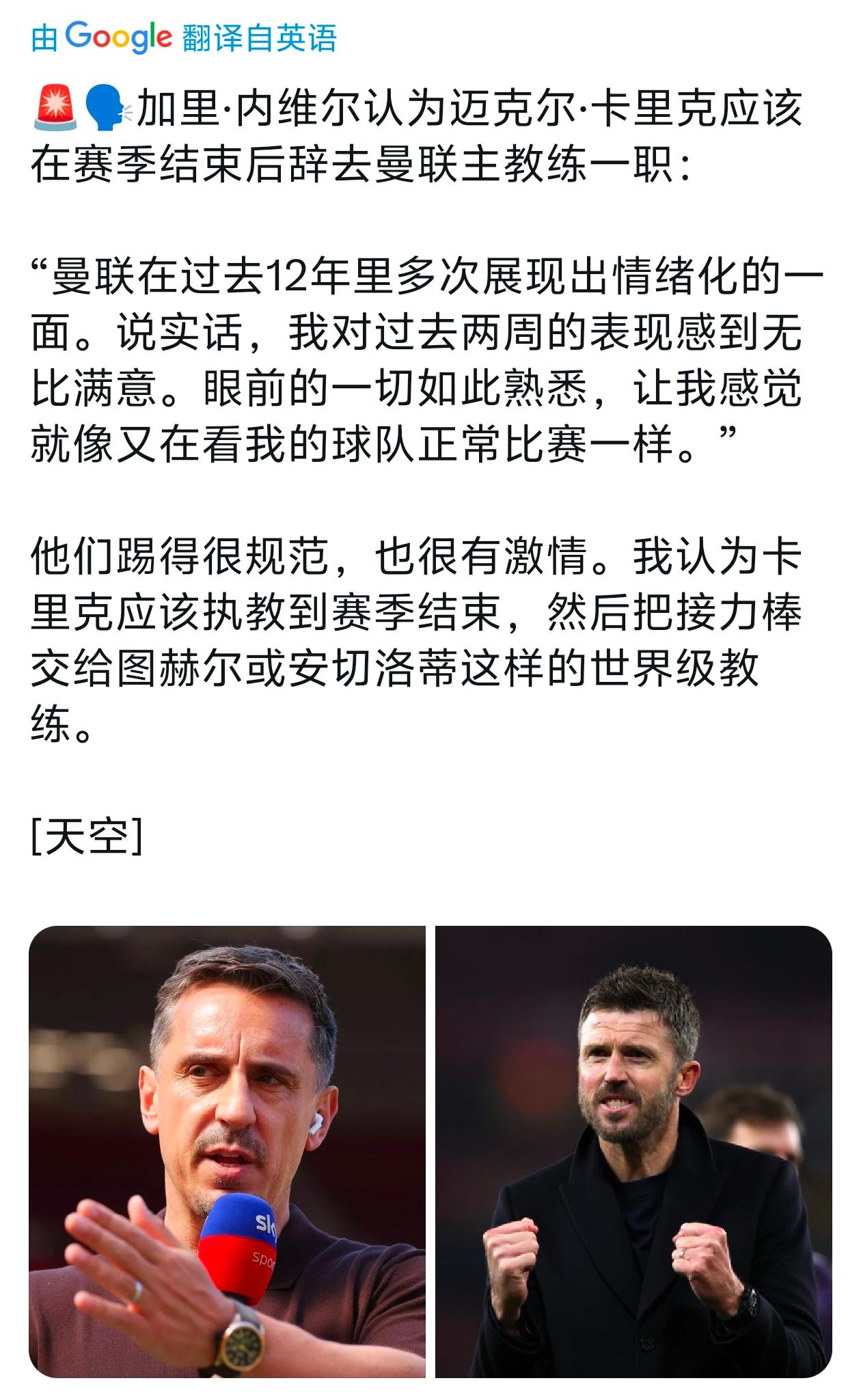 曼联名宿真让人看不懂,他们纷纷讨厌卡里克,这是眼红吗? 卡里克刚接手球队,战胜第一名阿森纳,战胜第二名曼城,加上上次执教成绩,4胜1平开局,没有教练能比得过。 结果曼联名宿基恩,加里内维尔都希望他赛季后辞职,给曼联换新帅?? 我是真的不懂,有懂曼联的球迷吗??[石化]