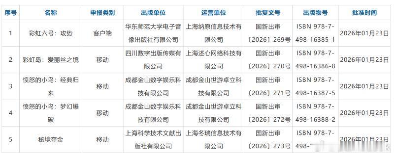 【177款国产5款进口游戏获版号:腾讯网易三七巨人恺英贪玩在列,《彩虹六号》过审网页链接】1月25日消息,今日2026年第一批版号正式下发,本批次共计有177款国产游戏、5款进口游戏过审,单批次过审游戏共计182款,为近几年的高值。过审国产游戏方面,其中移动游戏176款、客户端游戏12款。进口游戏5款中,4款为移动游戏、1款为客户端游戏(《彩虹六号:攻势》)。