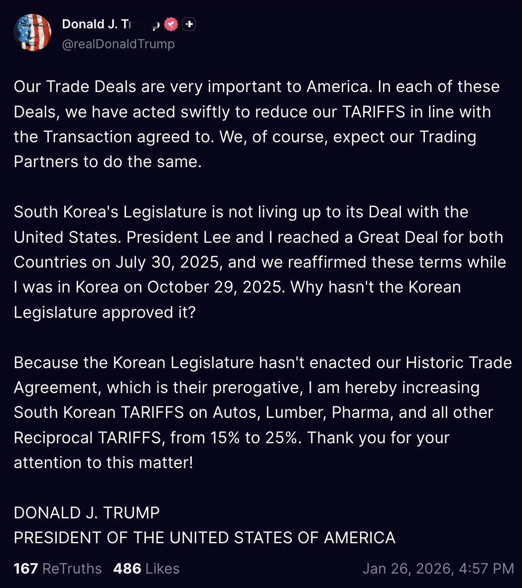 【美国将对韩国汽车关税提高至25%】美国总统特朗普26日在社交媒体上宣布,由于韩国国会仍未批准两国政府此前达成的贸易协议,美国对韩国汽车、木材、药品的进口关税以及其他“对等关税”的税率将从15%提高至25%。特朗普声称中国正完全接管加拿大 特朗普态度原地后空翻