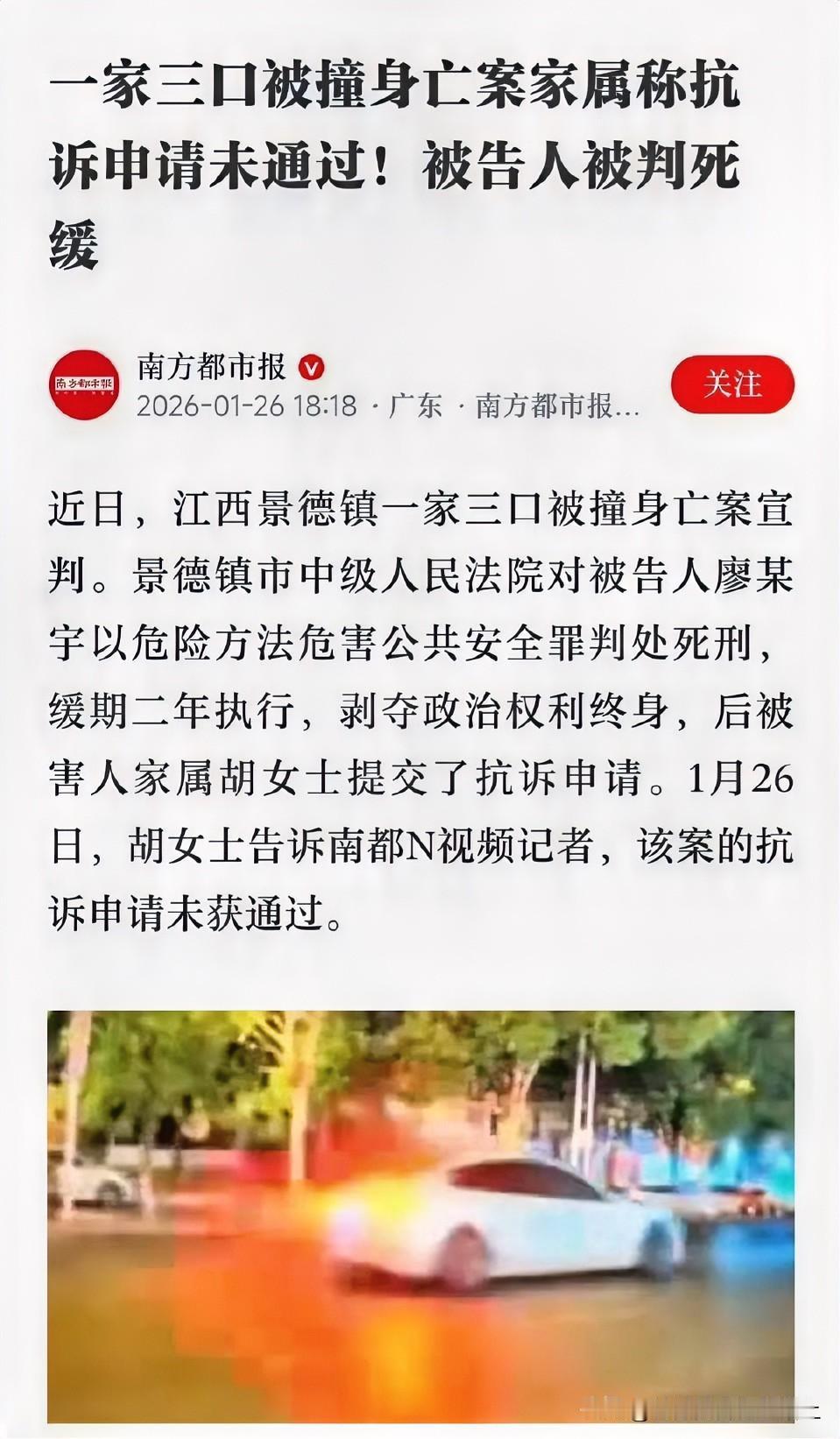 这个案子必将会载入史册: 凶手撞死一家三口,没悔罪,家属没谅解,死缓。 等肇事者几十年后出来,估计也就50岁左右,而被他撞的这家人,此时此刻可能一个人都没了。