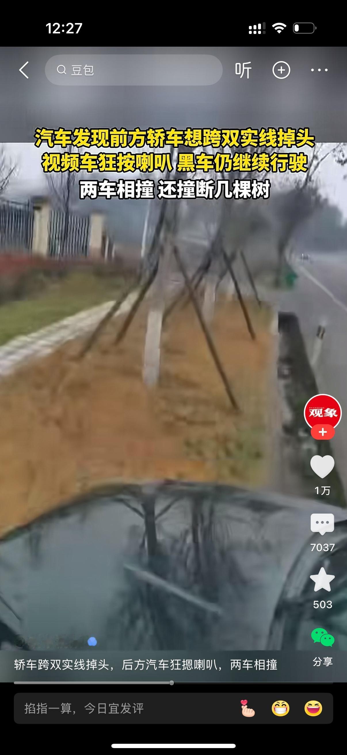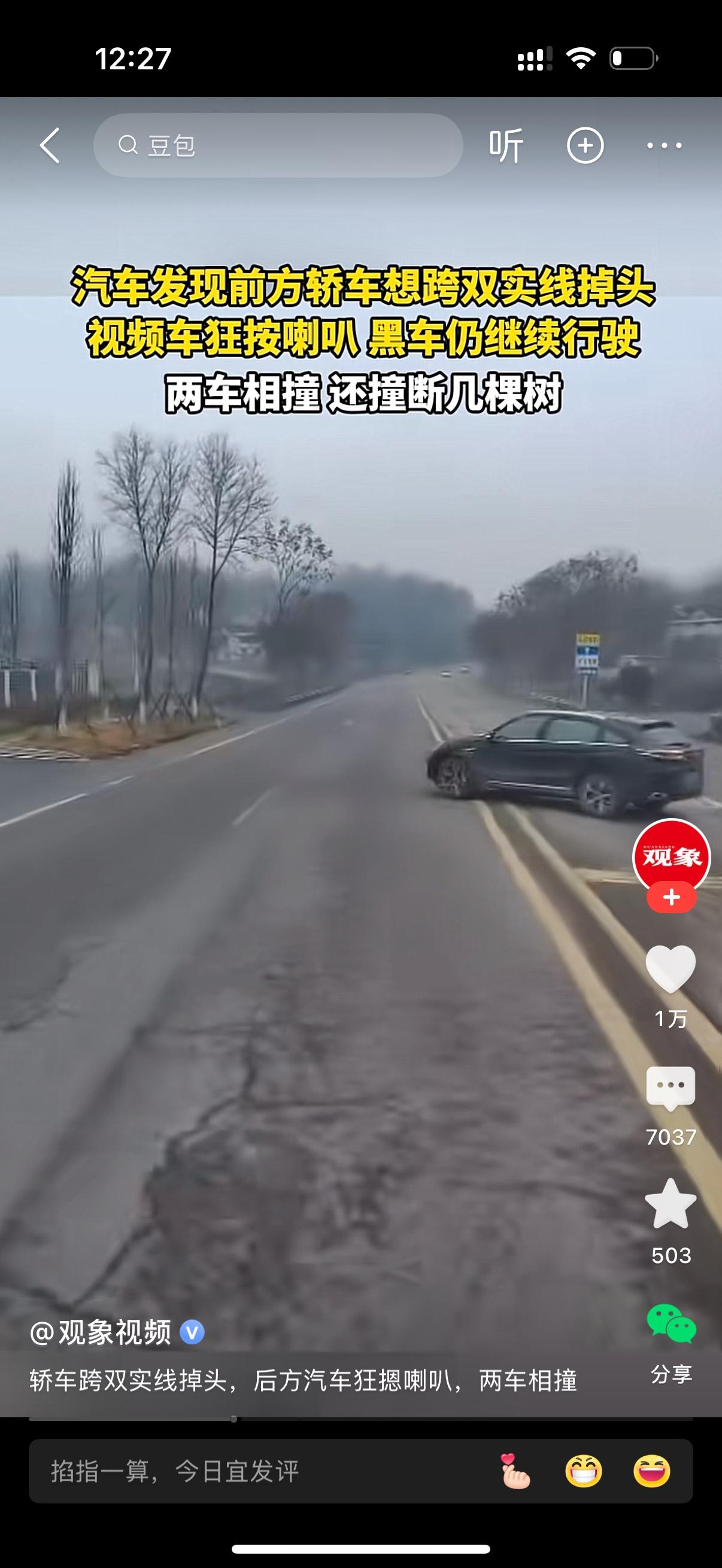 后面来车发现前方黑轿车想跨越双实线掉头,狂按喇叭。黑车仍继续行驶。后面来车居然没有减速停车,毅然决然地撞了上去。两车相撞,还撞断了几颗树。真的不明白后面的司机有时间按喇叭,为啥不减速停车,还拦腰撞了上去。也许他认为对方违法交规在先,自己撞了也没责任吧。