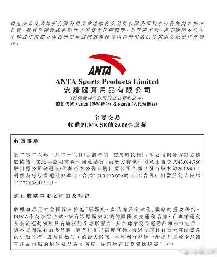 不是我对安踏有成见,安踏收购了什么牌子,这个牌子的价格一定会大涨,大家看看商圈里始祖鸟、萨洛蒙、可隆、迪桑特这些牌子,哪个不是四位数起步?而且价格比国外同款一定高不少,这个早就有人说过了,比国外价格高30%左右,明摆着就是在国内割韭菜,准确的说就是瞄准了中产阶级。对安踏,实在是爱不起来!安踏体育收购彪马公司29.06%股权安踏体育开涨1.51%安踏将成为彪马最大股东