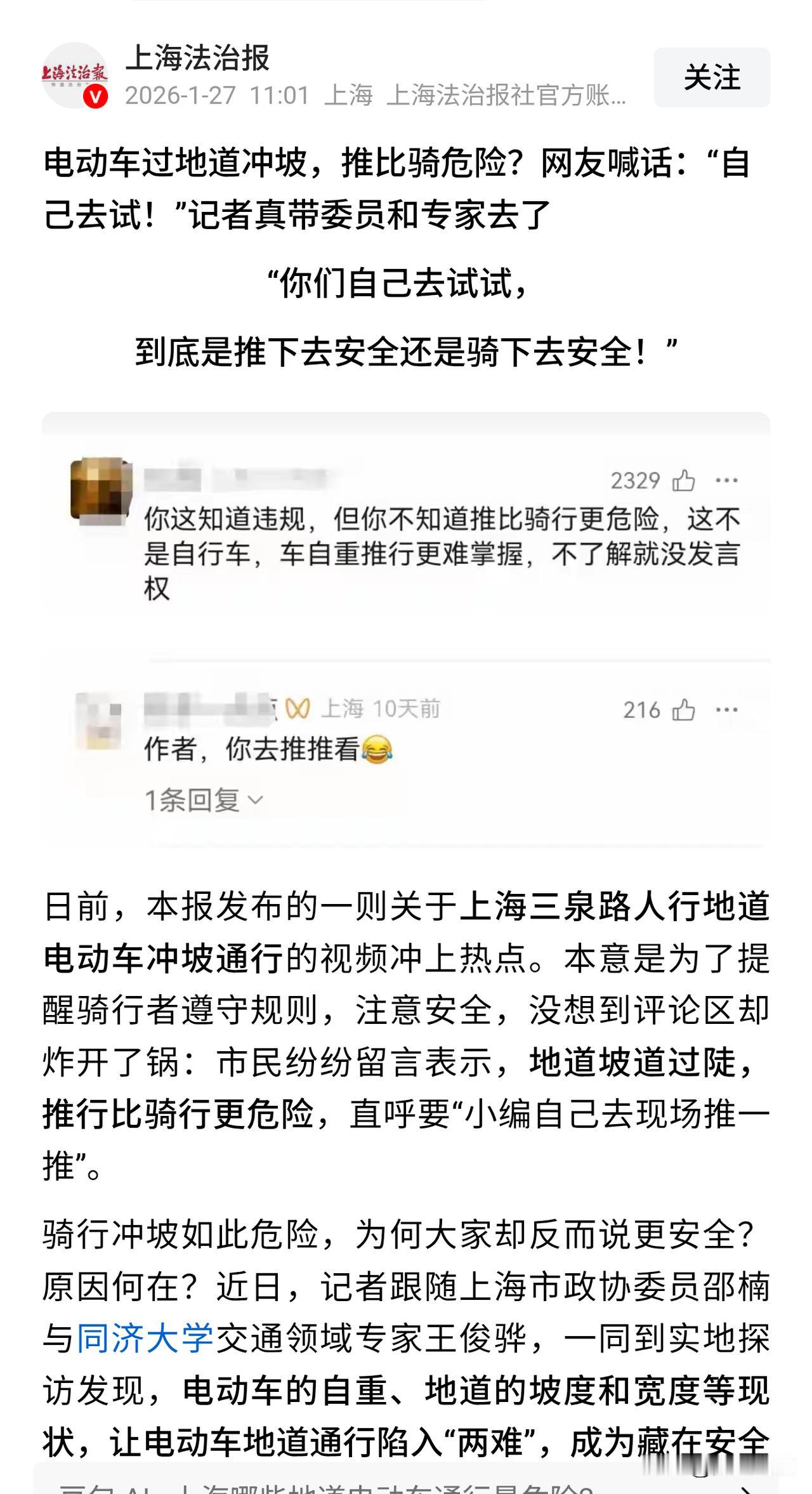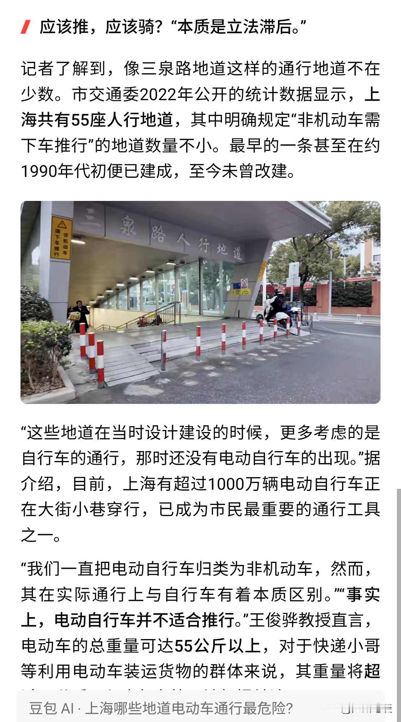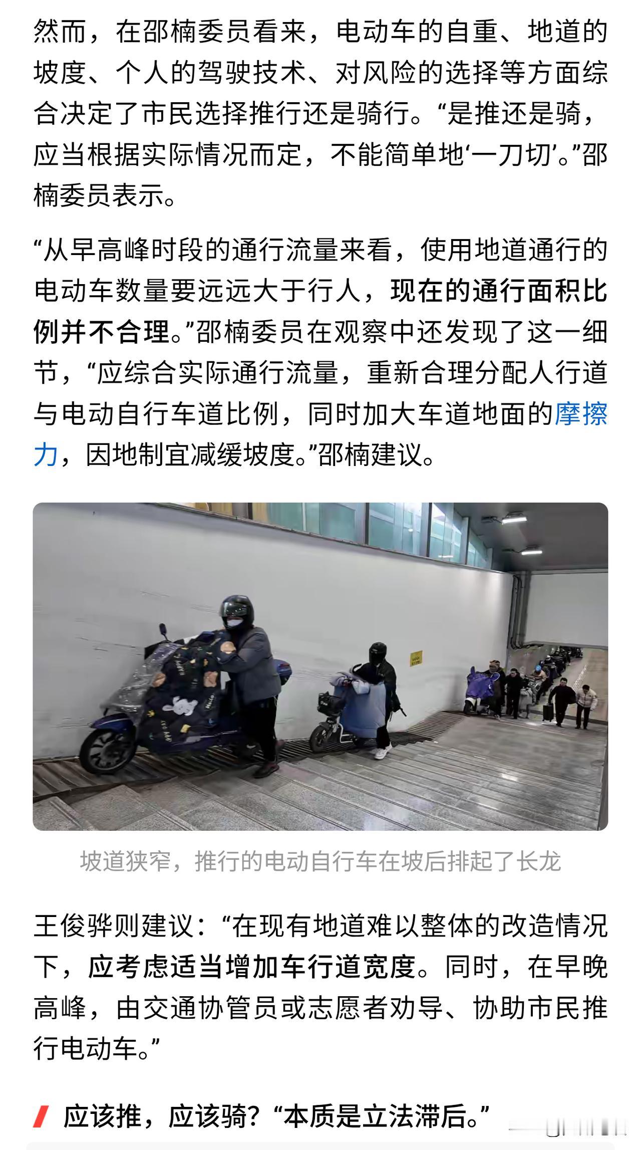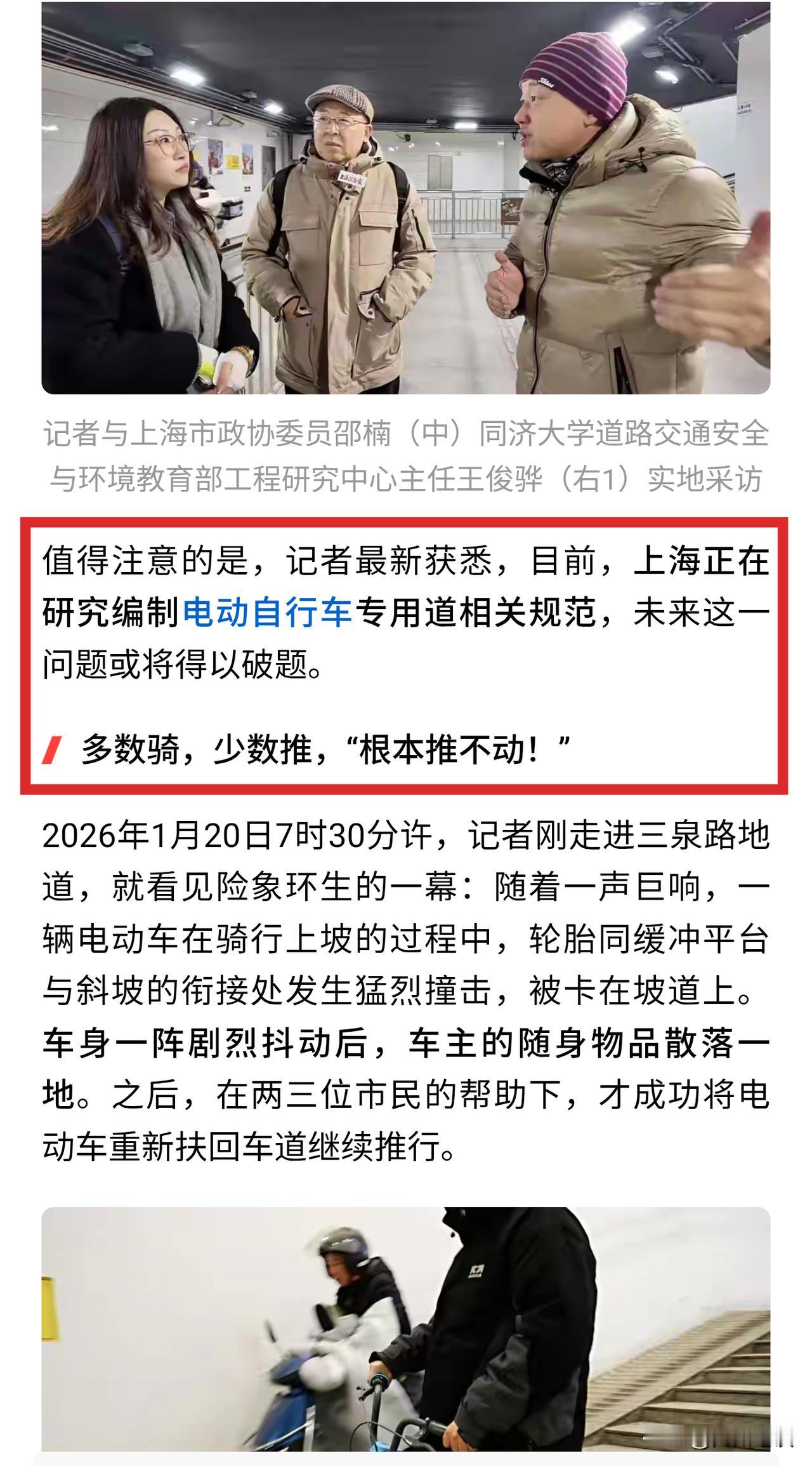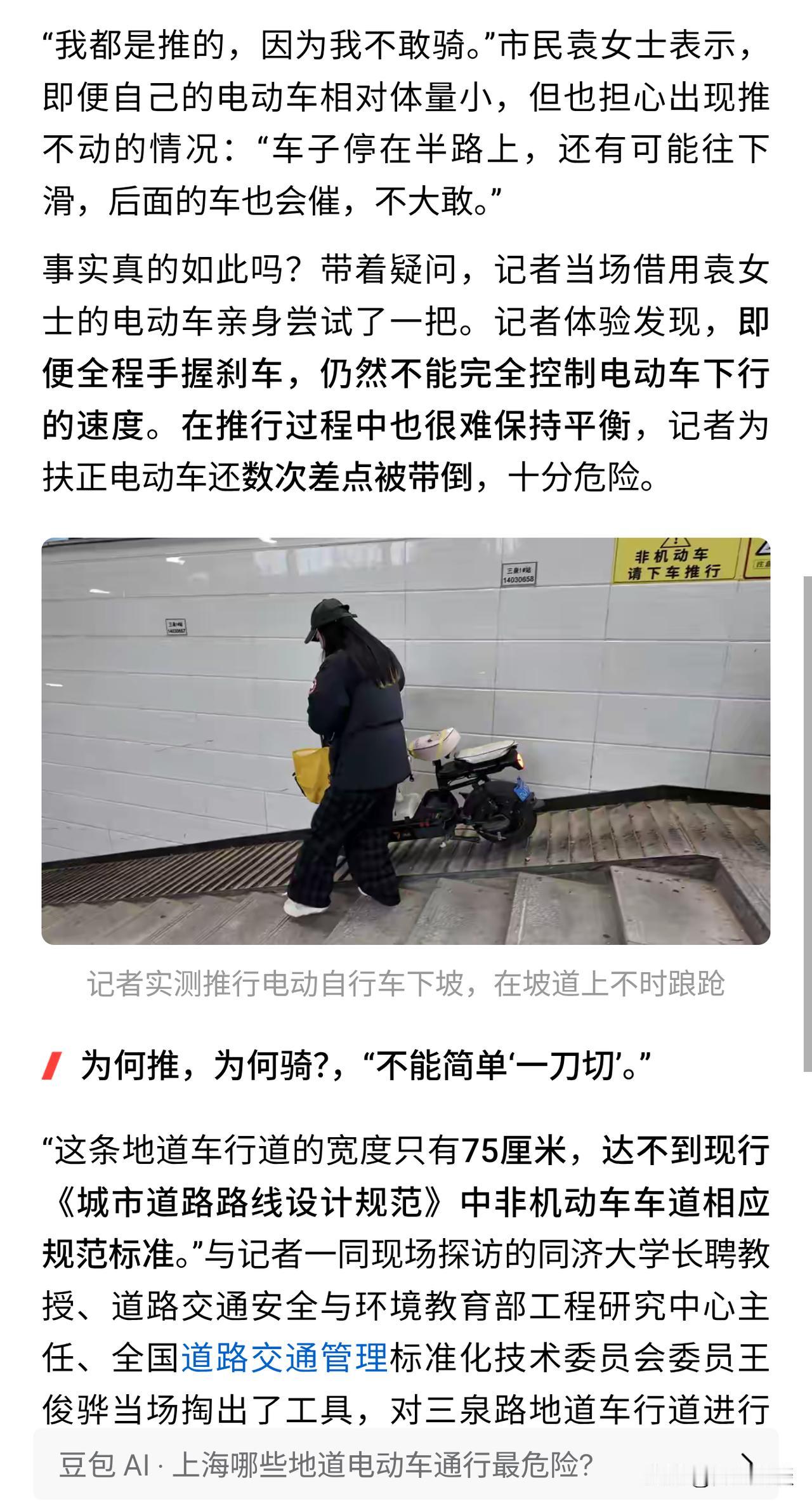 【小编带领委员专家赴约下车推行】上海千万电动自行车驾驶人有福了!电动自行车专用道呼之欲出!记者带领交通领域专家应网友邀约亲自赴三泉路地下通道拖电动车上下坡! 通过实地考察,推车下坡实地测量宽度坡度后,专家得出结论,现行标准落后于车辆发展,立法滞后! 地下通道的斜坡是根据自行车的宽度设计的,宽度不足80厘米,对于现在的电动车来说太窄了,无满足非机动车道的宽度要求。 或许重新分配地下通道道路资源,缩窄人行道楼梯,加宽斜坡便于电动车通行。 通过重新制定电动自行车专用道的标准,新建道路和改扩建的道路,设置电动自行车专用道,减少与行人、自行车、机动车之间的冲突,提高道路通行效率和安全性。 大上海真的是遥遥领先,上海居民太幸福了。 希望电动自行车专用道能推广到全国。