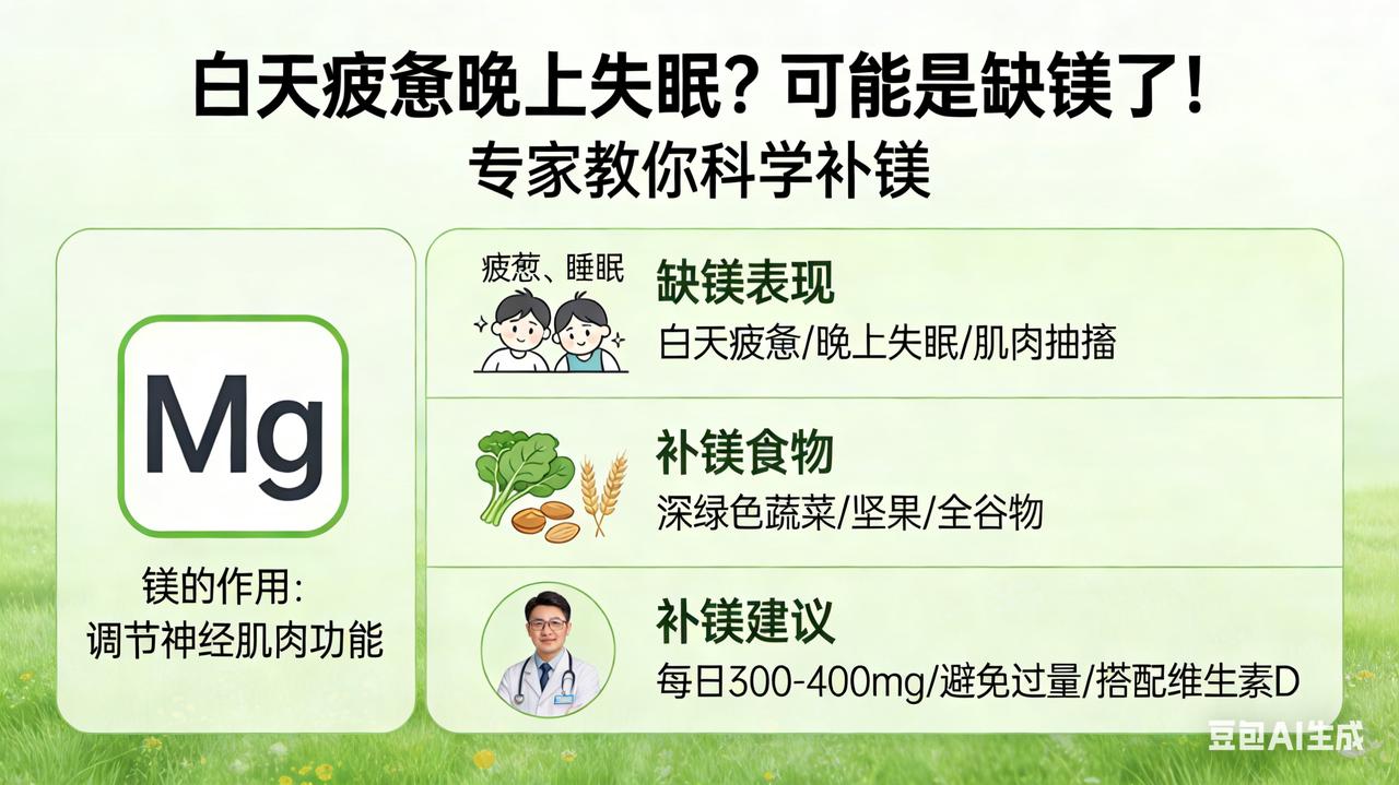 白天疲惫晚上失眠?可能是缺镁了!专家教你这样补 白天“电量虚红”,晚上“关机失败”?你缺的不是觉,是它 你是否正经历这种割裂感:白天靠咖啡强撑,眼皮沉重如灌铅,脑子却像生锈的齿轮转不动;好不容易熬到深夜,身体累到极限,大脑却异常清醒,翻来覆去数羊到两点? 别急着吃褪黑素,你可能只是缺了镁——这种被称为“身体刹车片”的矿物质,正悄悄决定你的精力与睡眠质量。 镁是如何“操控”你的昼夜节律的? 首先,它是细胞能量的“点火开关”。人体90%的能量(ATP)代谢都依赖镁激活。缺镁时,就像汽车没油,你会感到一种深入骨髓的“虚累”,怎么休息都缓不过来。 其次,它是神经的“镇静剂”。镁能阻断过度兴奋的谷氨酸,同时激活GABA受体(大脑的放松开关)。当镁不足,神经系统就像失去刹车的跑车,即便身体疲惫,神经依然紧绷,导致入睡难、半夜易惊醒。 更关键的是,高压会消耗镁,而缺镁又会推高皮质醇(压力激素),让你在深夜依然处于“战斗状态”。 如何精准“回血”? 现代饮食中的精米白面和糖是“偷镁强盗”。补救方案如下: 1. 食补优先:每天一把南瓜籽(镁库),多吃深绿色菠菜、羽衣甘蓝和黑巧克力(85%以上)。 2. 科学补充:若食补不足,推荐甘氨酸镁(最助眠、不伤胃)或苏糖酸镁(能穿过血脑屏障)。避开廉价的氧化镁(吸收率极低)。 3. 黄金时间:睡前1小时服用200-400mg,配合温水泡脚,效果翻倍。 坚持一周,你会发现那种“身体被掏空”的疲惫感消散,取而代之的是一觉到天亮的深度治愈。今晚,给身体补个“镁”,关掉大脑的强制运行吧。