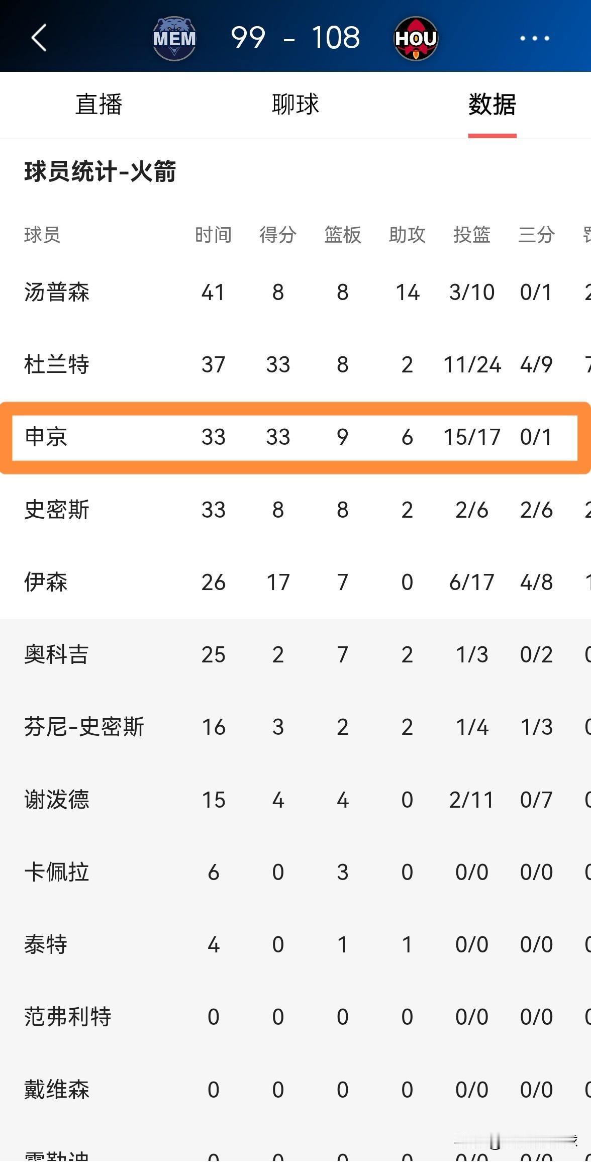 火箭当家球星杜兰特真是太会说话了!在今天火箭主场以108:99击败灰熊的赛后采访中,杜兰特聊到了申京在本场比赛中的高效表现,杜兰特这样说道:“他今晚投篮17中15,这太不像话了,因此投进15个球得到33分真是非常非常高效,他在攻防两端都是如此,这是一场匪夷所思的比赛。” 从杜兰特的言语中我们可以发现,本场比赛申京的无解表现竟然让见多识广的杜兰特感到震惊,这充分说明了申京的出色。