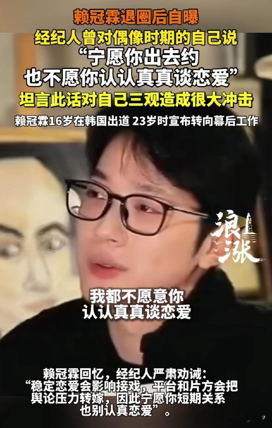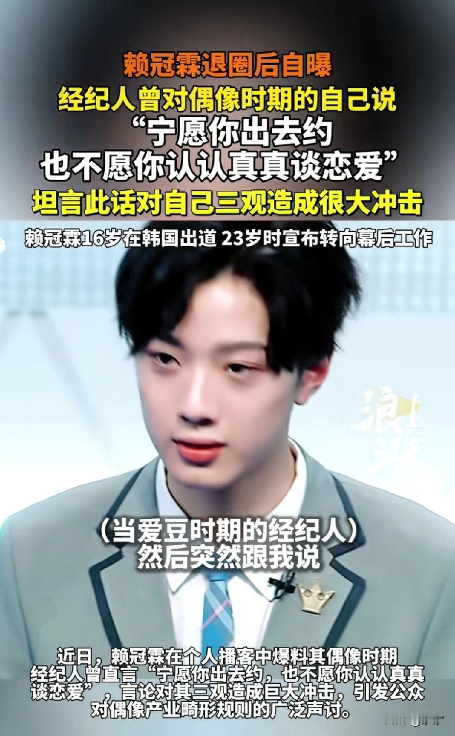赖冠霖退圈后自曝,当时在韩国出道非常受欢迎,他也想好好谈恋爱! 但是他的经纪人却告诉他,我宁可你出去约,也不希望你去谈恋爱,坦言这话对当时的他三观造成了很大的冲击! 赖冠霖回忆当时经纪人这样告诫他,是因为他觉得,谈恋爱会影响接戏,平台和片方会加压力转嫁,因此宁愿你短期关系也不要恋爱! 他这样的言论在直播中说了出来,直接引发了大众对偶像产业链的质疑,很多人觉得娱乐圈或许就是这样被搞坏! 他16岁在韩国出道,22岁宣布退圈并转向幕后工作,可能觉得这样的娱乐圈不适合他,毕竟他还是喜欢谈恋爱,认真对待自己的感情! 大家对于如此真实的赖冠霖怎么看? 赖冠霖 赖冠霖央视 赖冠霖播客