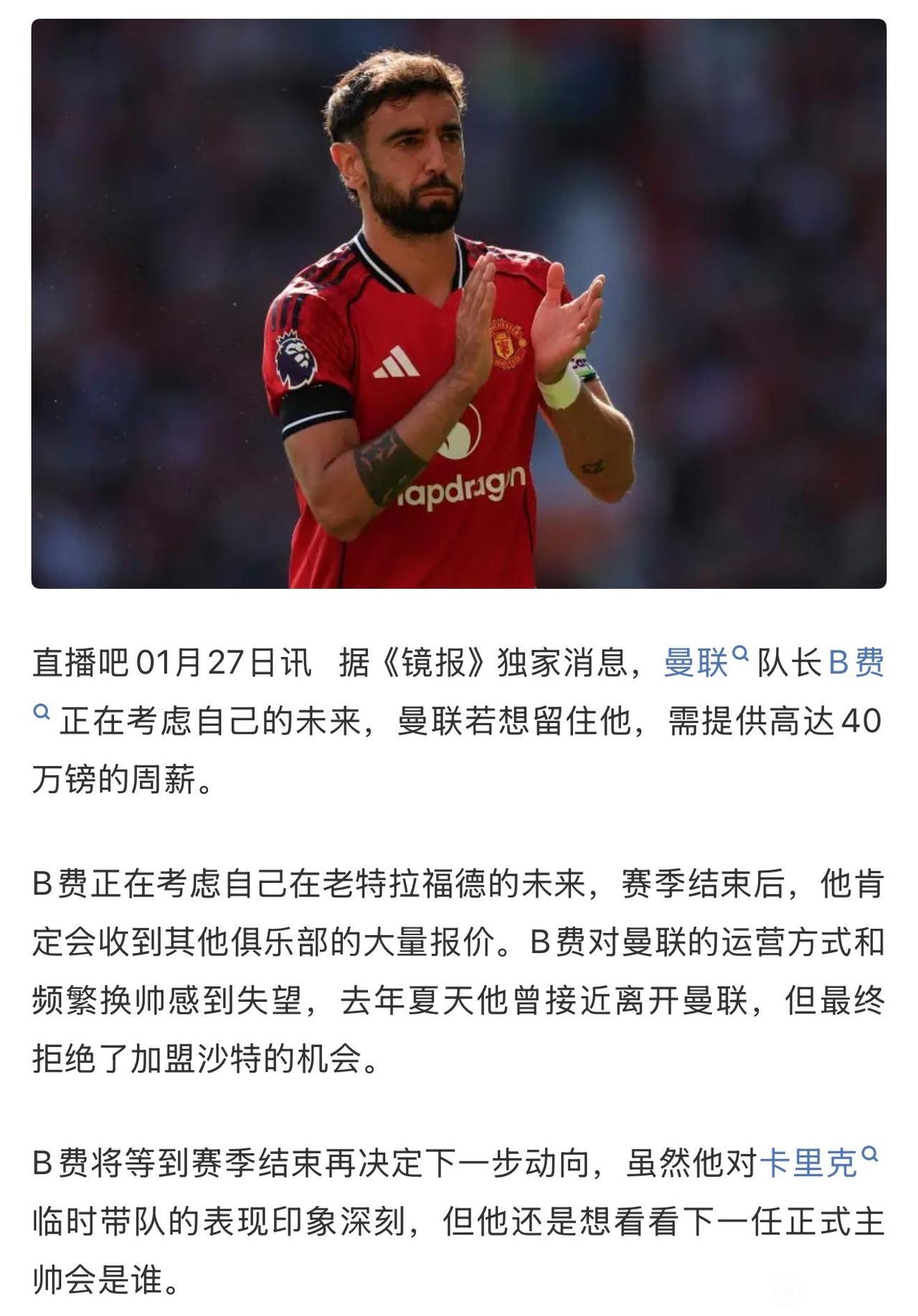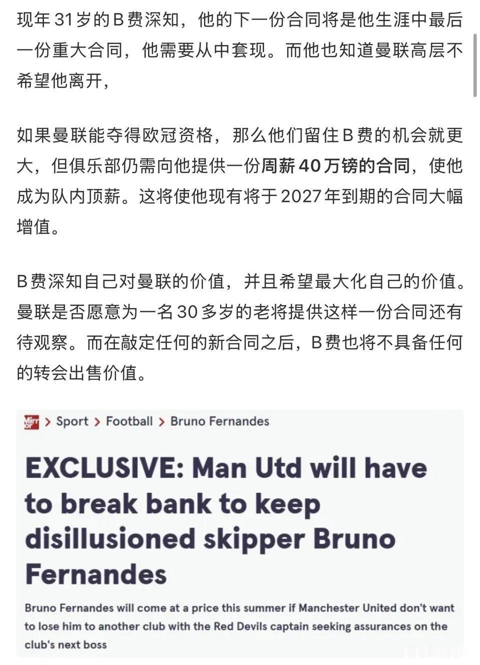40万英镑周薪才能留B费?估计不会续约了。 他31岁马上就是老将,曼联需要年轻人。 特别是高工资绝对吃不消,缘分看来到头了。 英国媒体故意这么说的,他快离队了。[尬笑]