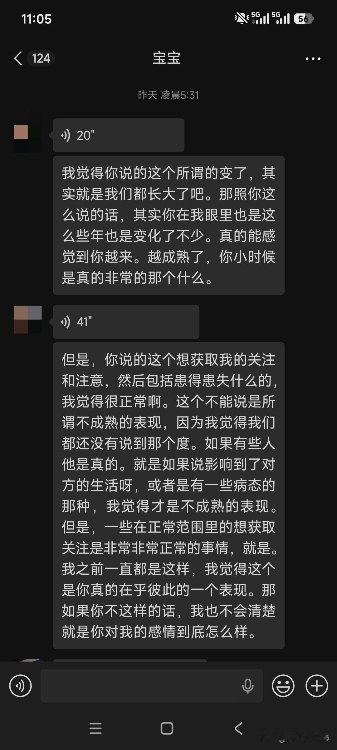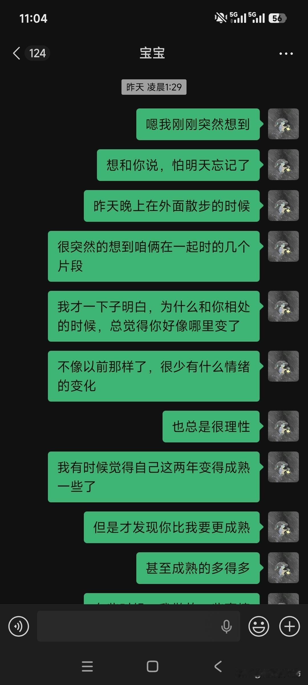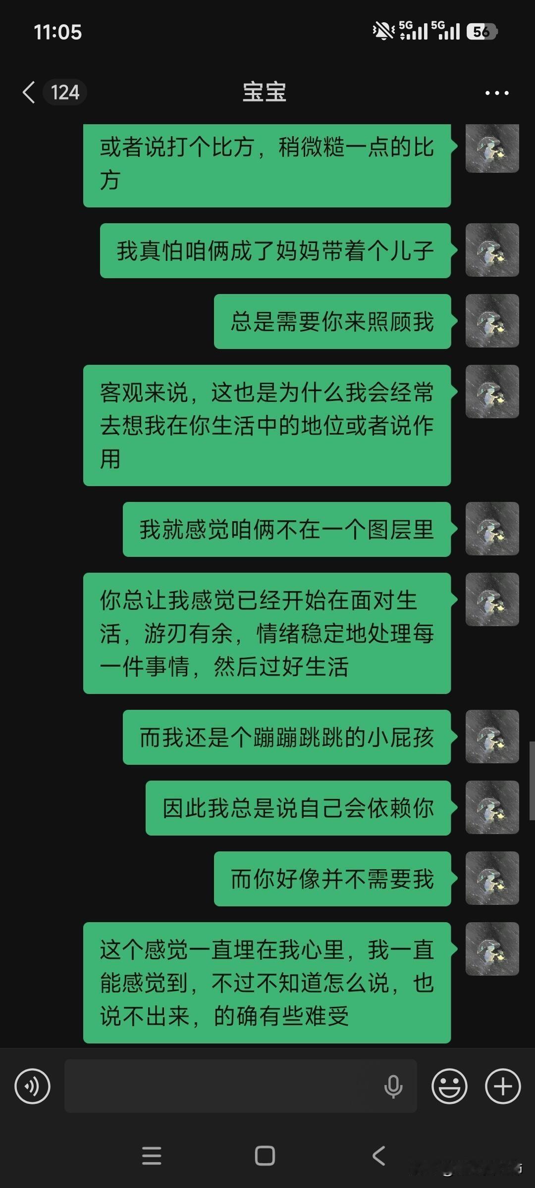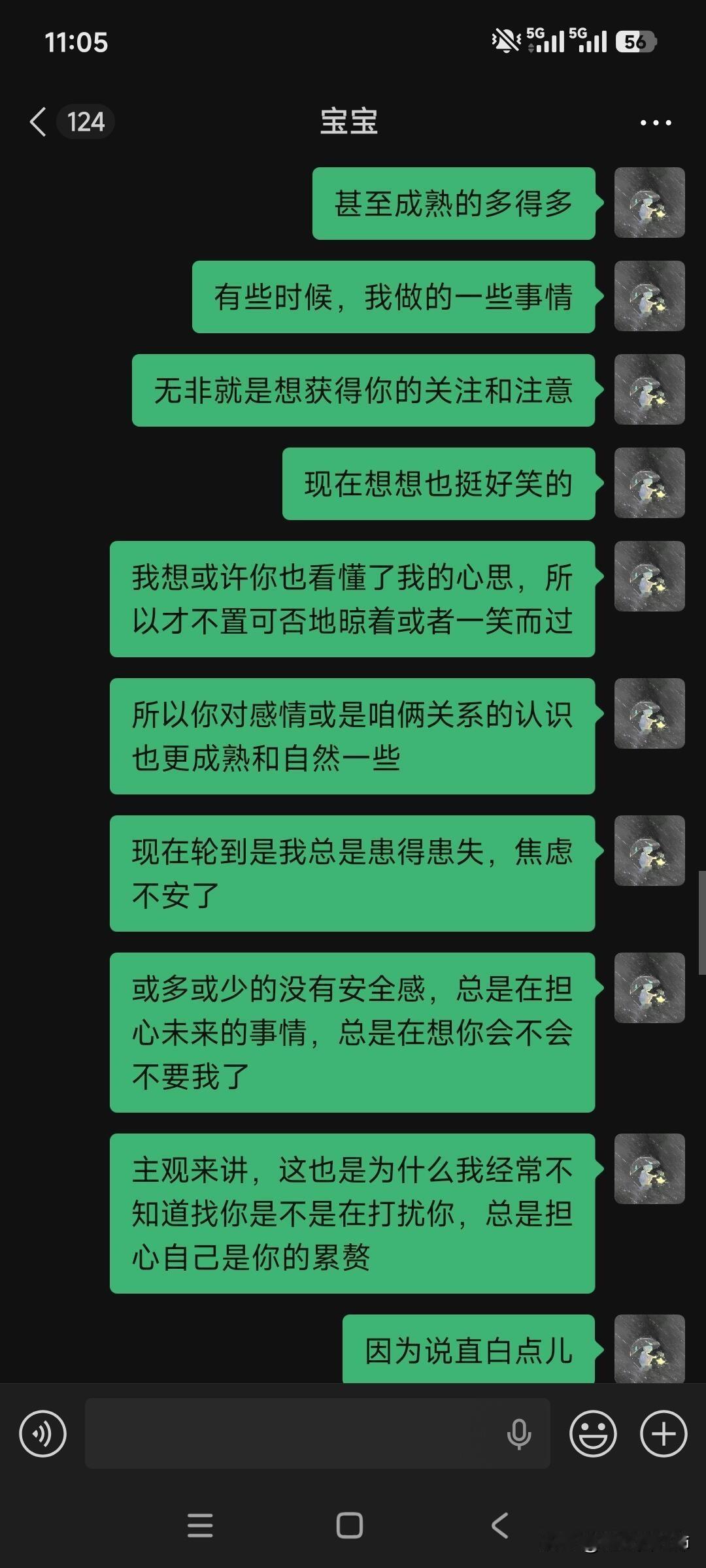 女朋友的这段话让我思考了很多... 不知道从什么时候开始,我发现自己在感情中总是患得患失,开始没有安全感。 她是i人,我是e人,我们两个异地,平时都很忙,不过每天也都有交流,有生活中的鸡毛蒜皮,也有一起讨论以后的安排。 她更喜欢淡淡的感情,享受细水长流的节奏,我更向往热烈的感情,渴望轰轰烈烈的爱情。不过我们都尊重对方的选择,也在磨合中不断找到适应我们的方式。 最近,或许是我这学期实在累到身心俱疲,我开始胡思乱想,开始出现越来越多的感情依赖,这让我有些担心。因为她平时的学习任务真的很多,我不想让自己成为她感情的累赘,更不想让她觉得我是感情中的巨婴,于是就和她说了我的心思。 看到她的话,其实我真的思考了很多,以往觉得自己面对现在的感情已经挺成熟了,现在才觉得在感情这一块,真的还有很多东西值得我们去思考和磨合...