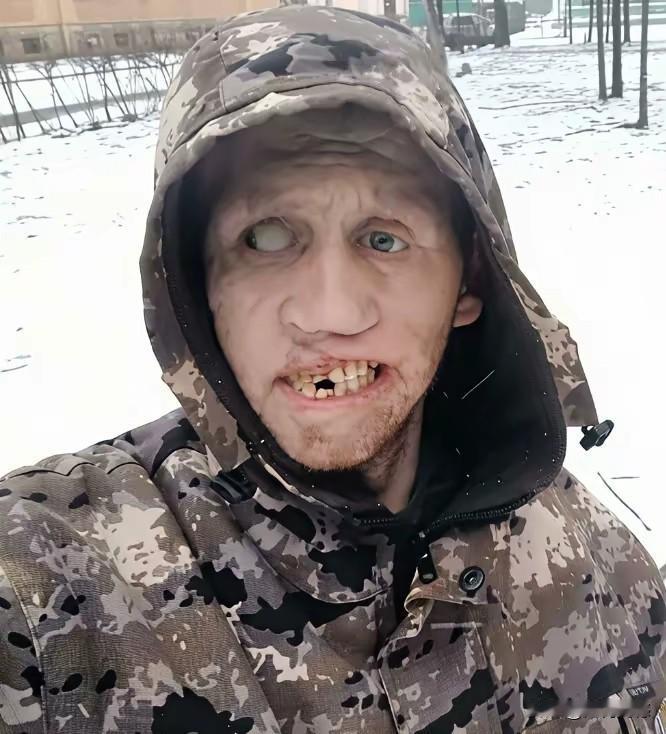 这个人的脸上应该是受过伤,眼睛,嘴巴,牙齿,都遭到了不同程度的破坏,如果没有猜错的话,感觉像是在战场上受的伤,因为这个人的穿着打扮,以及他的长相,感觉有点像是俄罗斯人,也许这是在俄乌战场上留下来的伤痕,战争是残酷的,只有经历过的人,才更加了解战争的残酷!