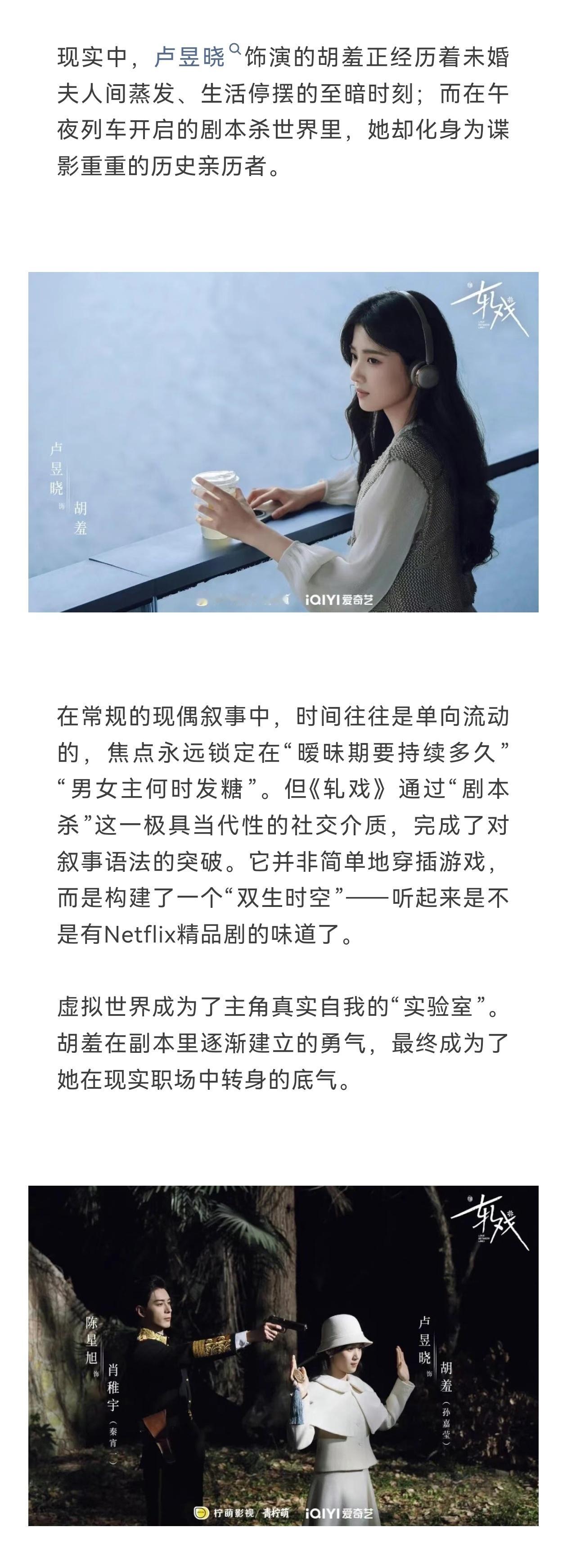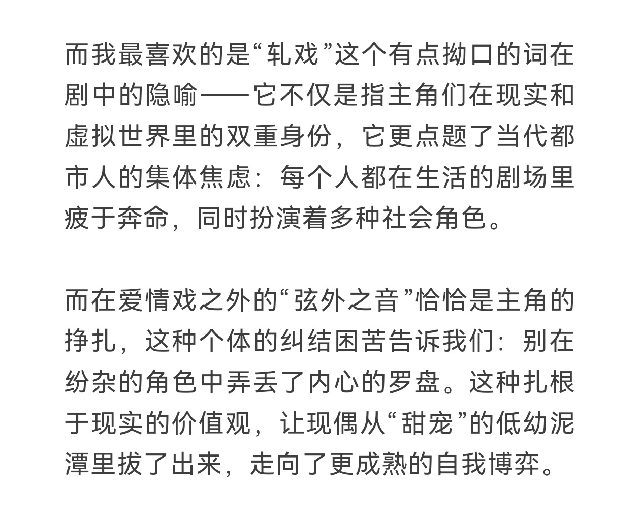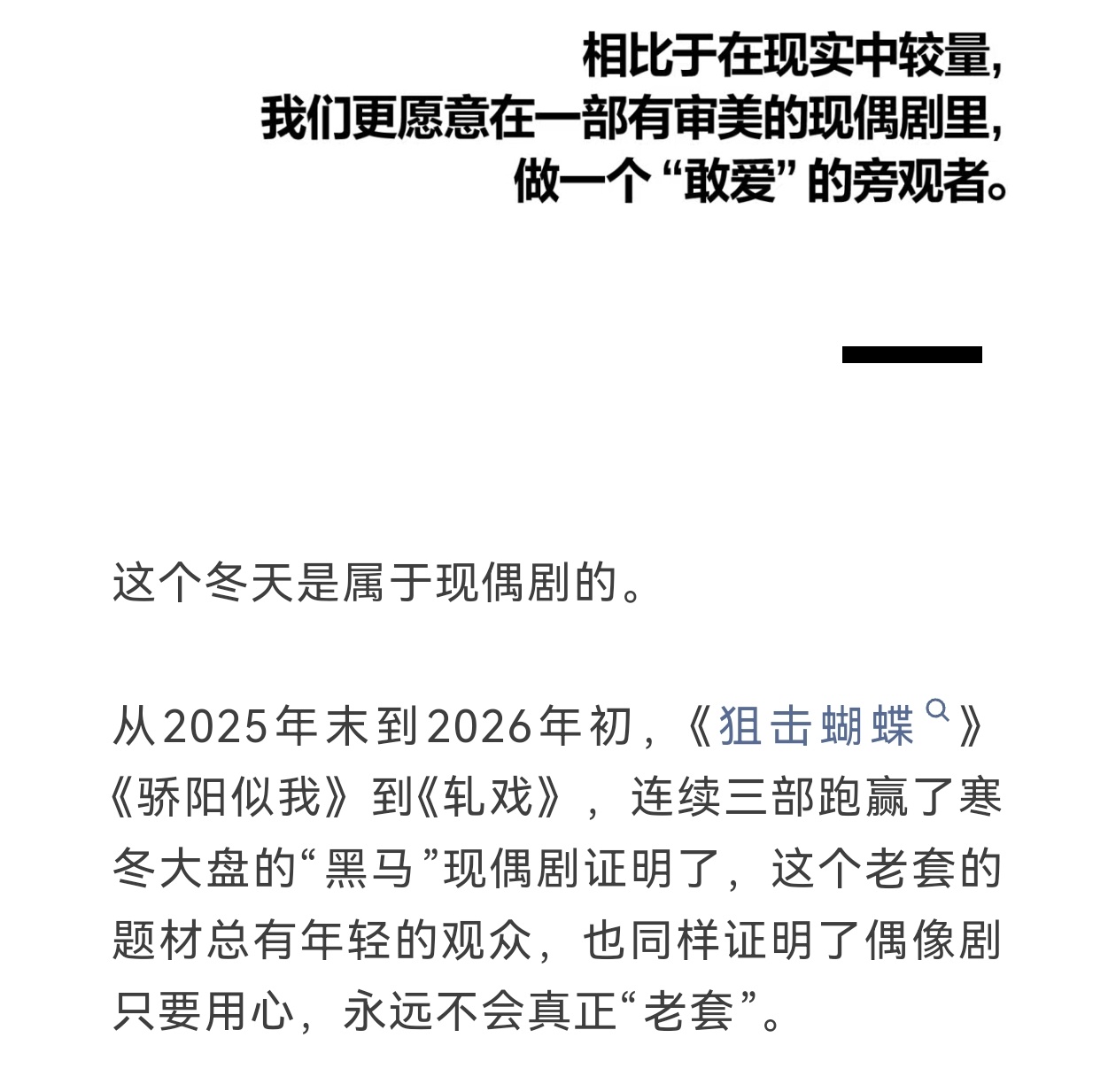 Vogue夸夸认证!《轧戏》是绝对意义上的这个冬天的黑马剧,从A级一路播成S级,实现了剧集和演员的双向飞升,好喜欢这句“现偶常有但轧戏不常有”!!🫂确实在常规的现偶叙事种脱颖而出的《轧戏》,用带点悬疑和身份转换的叙事,让主角在虚拟世界里建立爱与被爱的勇气,不仅让恋爱线更有层次,还悄悄完成了女主的成长觉醒。难怪说有点Netflix精品剧的味儿了。。内娱现偶全都卷起来啊啊💪 《狙击蝴蝶》《骄阳似我》到《轧戏》,连续三部跑“黑马”现偶剧盘赢了寒冬大盘,证明了只要用心拍观众是真的愿意买单的!多来点这样有想法、有嚼头的作品吧我爱看