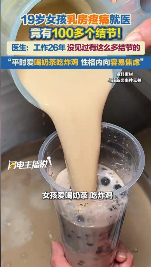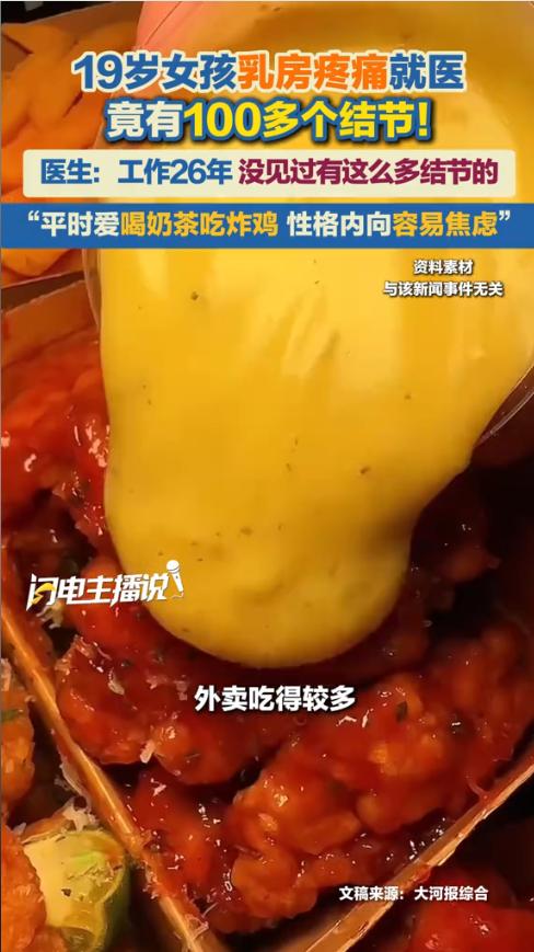 “悲剧还是发生了!”近日,河南,一19岁女孩特别喜欢奶茶、炸鸡、点外卖,平时性格内向,一有点事就容易焦虑,这天她感觉乳房疼痛难忍,就医检查后医生竟在她的乳房处出100多个结节!医生:从业26年从没见过这么多结节! 真是让人揪心,悲剧还是发生了!近日在河南,一名19岁的小姑娘,本来正是青春洋溢的年纪,却因为身体的剧痛,被查出了让人难以置信的问题乳房里竟然长了100多个结节,连见多识广的医生都直呼罕见。 这姑娘平时的饮食习惯,说起来也是很多年轻人的通病。不怎么爱吃家里做的饭,日常就靠奶茶、炸鸡打发,外卖更是天天点,高油高糖的食物几乎成了她的主食。渴了就灌一杯甜腻的奶茶,饿了就点份炸鸡配薯条,觉得这样吃方便又过瘾,压根没考虑过对身体的影响。 此姑娘不仅在饮食方面缺乏关注,性格亦较为内敛。她惯于将心事深藏心底,从不轻易示人,长久如此,对身心恐有不利。 不管是学习上的压力,还是生活里的小烦恼,从来不会跟家人朋友倾诉,就自己一个人扛着,时间久了,焦虑就成了常态。即便仅是一桩小事,也极易在心底反复思忖。思绪如入迷宫,越想越陷进死胡同,情绪也因此一直处于高度紧绷之态。 一开始,她就觉得乳房有点隐隐作痛,想着自己还年轻,大概率是青春期发育或者生理期的正常反应,也就没当回事,硬生生忍着没说。时光流转,疼痛感与日俱增,后期竟严重干扰正常生活。行止坐卧间,不适之感清晰可触。这才慌了手脚,在家人陪伴下,匆忙前往河南省肿瘤医院。 谁也没想到,检查结果会这么惊人。在超声介入门诊的显示屏上,黑白影像里密密麻麻全是结节,不是零星几个,而是足足100多个,像一张被病灶铺满的地图。接诊的翟渊鹏主任,已经在临床一线工作了26年,见过各种各样的肿瘤病例,可看到这样的影像,还是忍不住眉头紧锁,反复确认探头位置,生怕看错了。 翟主任直言,从业这么多年,他从来没见过数量这么多的乳腺结节,更别说发生在一个还不到20岁的孩子身上。为探寻致病缘由,医生率先对遗传因素展开排查。 经详细核查,姑娘家族并无相关病史,由此可推断,致病根源大概率在于后天因素。结合问诊详情,医生迅速锁定诱因。长期高油高糖的饮食习惯,加之持续的焦虑情绪,二者相互作用,共同催生了这些结节。 高油高糖的食物会打乱体内的激素平衡,而长期焦虑的负面情绪,对女性乳腺健康的伤害更是直接。当下,诸多年轻人自恃年少,以为体魄强健,便肆意挥霍健康。他们未曾意识到,人体的容错空间并非无穷无尽,过度损耗,终会让身体不堪重负。 如今乳腺结节的检出率越来越高,还在往年轻人身上蔓延。以前大家都觉得这是中老年人的问题,可现在18到29岁的年轻人里,检出率也在逐年攀升,每三个年轻女孩中,就可能有一个存在乳腺结节问题。这姑娘的情况,就是给所有年轻人提了个醒。 信息来源:《19岁女孩乳房疼痛,一检查竟有100多个结节!医生透露,女孩爱喝奶茶、吃炸鸡,外卖吃得较多!乳腺结节