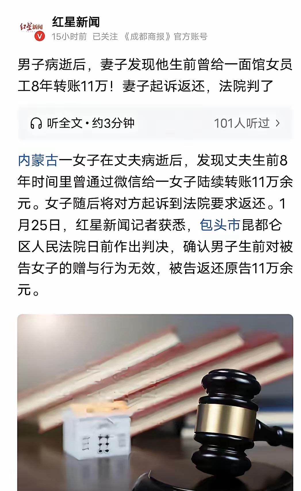 内蒙古,女子的丈夫病逝后,她收拾遗物发现丈夫在8年里给一面馆女员工转了117362元!她去找女员工要说法,女员工却说:他转钱给我,是让我帮他充值卡、买礼品、买饭卡用的,这钱我一分没拿,都是他自己消费的,见女员工死活不承认,女子一气之下告上法院。 2025年4月,郭女士还没从丧夫之痛里走出来。 丈夫王某走得猝不及防,没留一句遗言,她只能对着遗物一遍遍怀念过往。 整理丈夫手机时,她习惯性点开微信支付账单,下一秒就僵住了。 账单里藏着一个惊人秘密:从2017年开始,整整8年,丈夫一直在给同一个人转账。 没有520、1314这类暧昧备注,全是几十、几百的小额,偶尔还有几块钱的零钱。 一笔笔累加下来,居然有117362元! 这可不是小数目,对普通家庭来说,能顶大半年开销了。 郭女士赶紧看收款人名字——郭某乙,她压根没听过这个名字。 多方打听才知道,郭某乙不是什么亲戚朋友,就是家连锁面馆的女员工。 郭女士心里又气又疑,当即找到那家面馆,当面质问郭某乙。 面对找上门的原配,郭某乙一点不慌,说辞听得头头是道。 “大姐你别误会,王哥是我们店老主顾,转的钱都是让我帮忙办事的。” “要么帮他充面馆储值卡,要么买礼盒、办饭卡,钱全换成东西给他了,我一分没留!” 她还补了句:“你看8年几百笔转账,没一笔特殊金额,真就是吃饭消费的钱!” 这话听着像那么回事,郭女士当场犯了嘀咕。 难道真是自己多疑,丈夫只是爱吃这家面,多照顾店员生意? 可转念一算,她立马醒过神:8年11万,就算天天吃面,一天也得花30多! 何况丈夫很多天根本没去店里,照样有转账,这根本说不通! 郭某乙死活不认账,不肯退钱,郭女士没犹豫,直接把她告上了法院。 法庭上,双方说法针锋相对,没有半点退让。 郭女士的诉求很明确:这笔钱是夫妻共同财产,丈夫瞒着她转给外人,属于无权赠与,她没同意,赠与就无效,郭某乙必须全额返还。 郭某乙却一口咬定:这是正常消费款,不是赠与! 她是店员,王某是顾客,收钱办事天经地义,钱全花在店里,跟她没关系。 法官当场抓住关键,直接追问郭某乙:既然是帮忙储值买东西,充值记录呢?消费小票呢?礼盒领取凭证呢? 这话一出,郭某乙瞬间支支吾吾,拿不出任何证据。 法官又算了笔明白账:就算王某天天吃面,8年11万日均30多元,还有不少没到店的日子也有转账,完全不符合正常消费逻辑。 庭审时还出现了争议声,有人说该返还一半,毕竟死者也有一半夫妻共同财产。 但这里要给大家科普个法律常识,很关键! 只要没离婚,夫妻婚姻存续期间的所有收入,不管是谁挣的,都是共同财产。 处置大额财产必须经双方同意,哪怕是死者生前私自赠与,原配不知情不同意,赠与行为都不算数。 这不是偏袒谁,是法律对合法夫妻共同财产的硬性保护! 法院审理后,给出了明确判决: 王某转账的117362元,全是婚内夫妻共同财产,他瞒着妻子转给郭某乙,属于无权处分,赠与行为无效。 而且王某8年持续转账,违背夫妻忠实义务,也不合公序良俗,还给郭女士造成了财产和精神双重伤害。 最终判决郭某乙,全额返还117362元给郭女士! 这事想想真让人唏嘘,王某看着老实,却用8年几千次小额转账,悄悄转移夫妻共同财产。 这种细水长流的背叛,比一次性挥霍更寒心,既骗了妻子,也辜负了家庭。 好在郭女士没忍气吞声,拿起法律武器护住了自己的权益,这份清醒和勇气,值得所有人点赞! 这里也提醒大家,夫妻之间对共同财产有知情权,遇事别慌,法律会给公道。 最后想问大家两个争议问题:你觉得法院这个全额返还的判决合理吗?如果是你遇到这种事,会第一时间找对方对峙还是直接起诉?欢迎评论区留言讨论,别忘了点赞分享,让更多人懂法护权益! 丈夫给前妻转账
