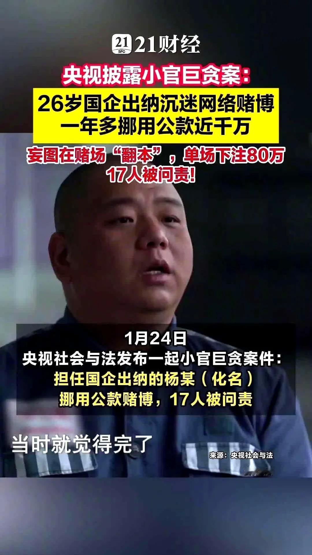 刚看到个新闻,给我整不会了。 一个26岁的小伙子,在国企当出纳。 一千万。是的,你没看错,八位数,一千万的公款,就这么从他手里“蒸发”了。 拿去干嘛了? 赌。 26岁的国企出纳杨某,陷入网络赌博无法自拔,从信用卡透支到网贷缠身,再到挪用公款妄图在赌场“翻本” 单场下注80万元。 据报道,26岁的国企出纳杨某,陷入网络赌博无法自拔,1年5个月内,挪用公款近千万。从信用卡透支到网贷缠身,再到用公款妄图在赌场“翻本”,单场下注80万元,同学结婚包5000元彩礼炫耀,虚荣与贪念交织,理智被欲望吞噬,公款成了他恣意妄为的筹码。可疯狂的赌局终有尽头,最终他等来的是13年6个月的铁窗生涯。 我就问一下,26岁的小伙子是怎样当上国企出纳的,24岁就入职了,不知大学有读完了没? 一个小小的出纳,不可能这么容易贪污的,财务管理是层层把关的。 国企钱真多,上级领导不就几个亿。 网友表示:把所有编制内的官人员,同时公示资产贪腐者直接枪毙了。 赌博害人,十赌九输,这个道理都不懂,能让人家破人亡,妻离子散。好好珍爱生命吧。知错能改,善莫大焉。 出纳不是什么小官。 是职务犯罪。 去广大的农村查一查村官吧! 那才是小官巨贪的大本营。 曝光具体是哪个国企啊! 挪用犯罪超一年,会计、财务负责人、法人代表无疑是渎职罪。而且这个国企内部财务管理无疑是漏洞百出,单位很可能有“小金库”(若没小金库,千万级别被挪用,根本早就被发现) 犯罪成本也很低嘛。千万级别公款贪污挪用,别说死刑,连有期徒刑的上限15年都没。有没有重罪轻罚? 中国的贪官太可怕了,关键对贪官的处治没有起到一定效力,凡贪上千万的一律死刑,看钱重要还是命重要。