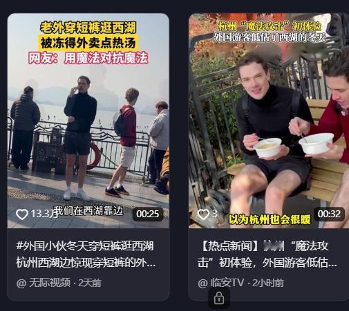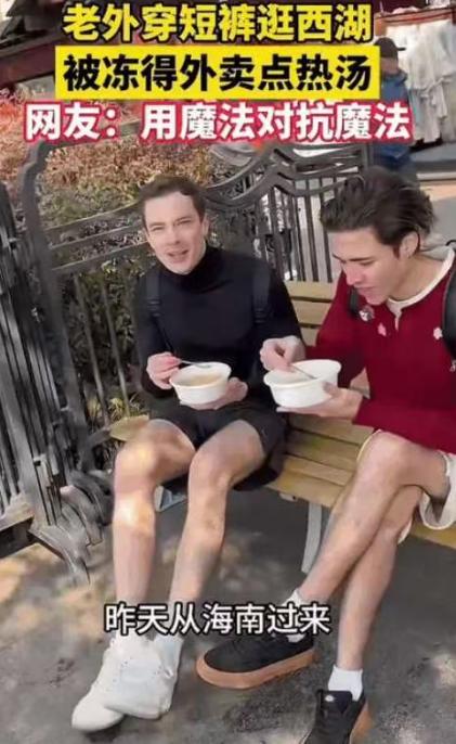 也是没谁了!杭州,一男子在西湖边游玩时,意外看到2个外国人穿着短裤在漫步,不禁感叹“老外这么抗冻的吗?”谁知,没过一会儿,老外就朝着不远处一个外卖员打起了招呼,男子以为他们点的是保暖类的衣物,结果发现并不是! 前两天西湖边的气温直接砸到了零下三度,空气湿冷得让人恨不得把五官都缩进围巾里。就在这一片裹得像粽子一样的人潮中,视觉画面里突然出现了两个极其违和的噪点,两名外籍男子,竟然穿着短裤在湖边溜达。 不是那种运动紧身裤,是实打实的夏日沙滩短裤,大半截腿就在寒风里裸奔。路过的游客第一反应大概都差不多,甚至带着点羡慕:“看看人家这身体素质,这就是种族天赋吧?” 但你要是稍微停下脚步多观察两分钟,滤镜碎得比冰渣还快。这两个哥们儿根本不是什么钢铁之躯,正站在风口里疯狂跺脚,两只手拢在嘴边拼命哈气,整个人都在高频震动。 显然,这属于生物本能被环境教做人了。这时候,一辆外卖电动车成了全场的焦点。两个老外像是看到了救星,甚至不用看定位,估计电话里只要说一句“西湖边唯二穿短裤的傻瓜”,骑手就能在一秒钟内锁定目标。 围观群众都在心里暗暗点头:这就对了,赶紧买两条棉裤套上,哪怕买个毯子披着也行啊,这天气可不是开玩笑的。 结果骑手把餐箱一开,递出来的不是纺织品,而是两个圆滚滚的打包盒,盖子一掀,热气腾腾。那是两份大骨头汤。这剧情走向直接把大家看懵了。在零下三度的冷风里,不买衣服先买汤?这得是什么脑回路? 上去一聊才知道,这其实是一场惨烈的地理认知事故。两人刚从海南三亚直飞杭州。在他们的认知地图里,Sanya是南方,Hangzhou也是“China'sSouth”,既然都是南方,那肯定依然是阳光沙滩比基尼。 谁能想到,中国的“南方”和“南方”之间,温差能跨越整个季节。落地之后发现没有带长裤,附近又找不到商场,只能硬着头皮逛。 至于为什么买骨头汤,这解释简直让人笑出声。他们觉得膝盖骨被风吹得生疼,然后想起了一句神秘的中国古话“吃啥补啥”。 既然骨头冷,那就喝骨头汤补一补。面对物理伤害,他们放弃了物理防御,选择用“中式玄学”来进行内服治疗。这波操作,既荒诞又带着点让人心疼的天真。 看着他们端着热汤在寒风中瑟瑟发抖试图“暖膝盖”,你只能感叹,这大概就是文化输出最硬核的一次误读了。