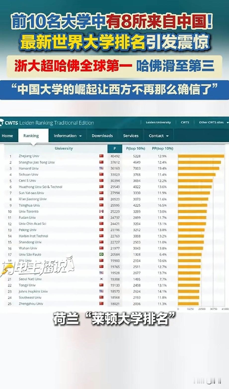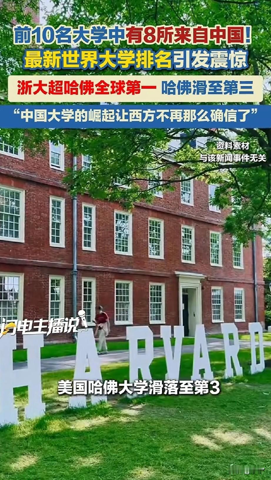 近日世界大学排名出来了,不仅老外不敢相信,就连中国人也不敢相信,前10的世界大学中国居然占了8个! 以前都是国外大学排名靠前,如今中国大学迅速崛起,世界排名前10的大学,中国占了8个, 这个大学排名可是莱顿排名,权威性非常高,这个排名非常公平,只看论文数量和科研成果! 浙江大学居然排名世界第一,哈佛大学排名第三,清华大学排名第九,北京大学排名第13, 果然依靠精英教育,用金钱和校友名义办学真的不行,好大大学应该是科研成果比较厉害。 那不父母是校友捐点钱就获得了入学资格,这样的大学不衰落那是不可能的,现在的哈佛大学就是这个情况, 2/3的哈佛大学学生,他们不是通过成绩进入大学的,都是父母通过关系写推荐信,捐款进入的,这些人根本做不出科研成果! 还有一些人通过一些特别的手段,换个身份拿着一些自己办的比赛奖项,申请进入哈佛大学, 就是这些人将哈佛大学拉下了世界神坛,大学的排名早该如此了,就应该以科研和论文实力排名,曾经的辉煌不代表未来也会辉煌! 那些花了几十万将孩子送入这些名校的家长们要破防了,自己倾尽一切,将孩子送出国读名校,没想到世界名校就在国内! 怪不得近几年国内的状元选择清华北大的很少,反而选择浙江大学和上海复旦大学,以及哈工大的那么多,原来大家早就看到了这些大学的衰落! 浙江大学好样的,希望发展的越来越好,拿出更多的科研成果比啥都强? 中国大学实力榜 全球大学排行 大学排名 全球高校排名 全球大学榜