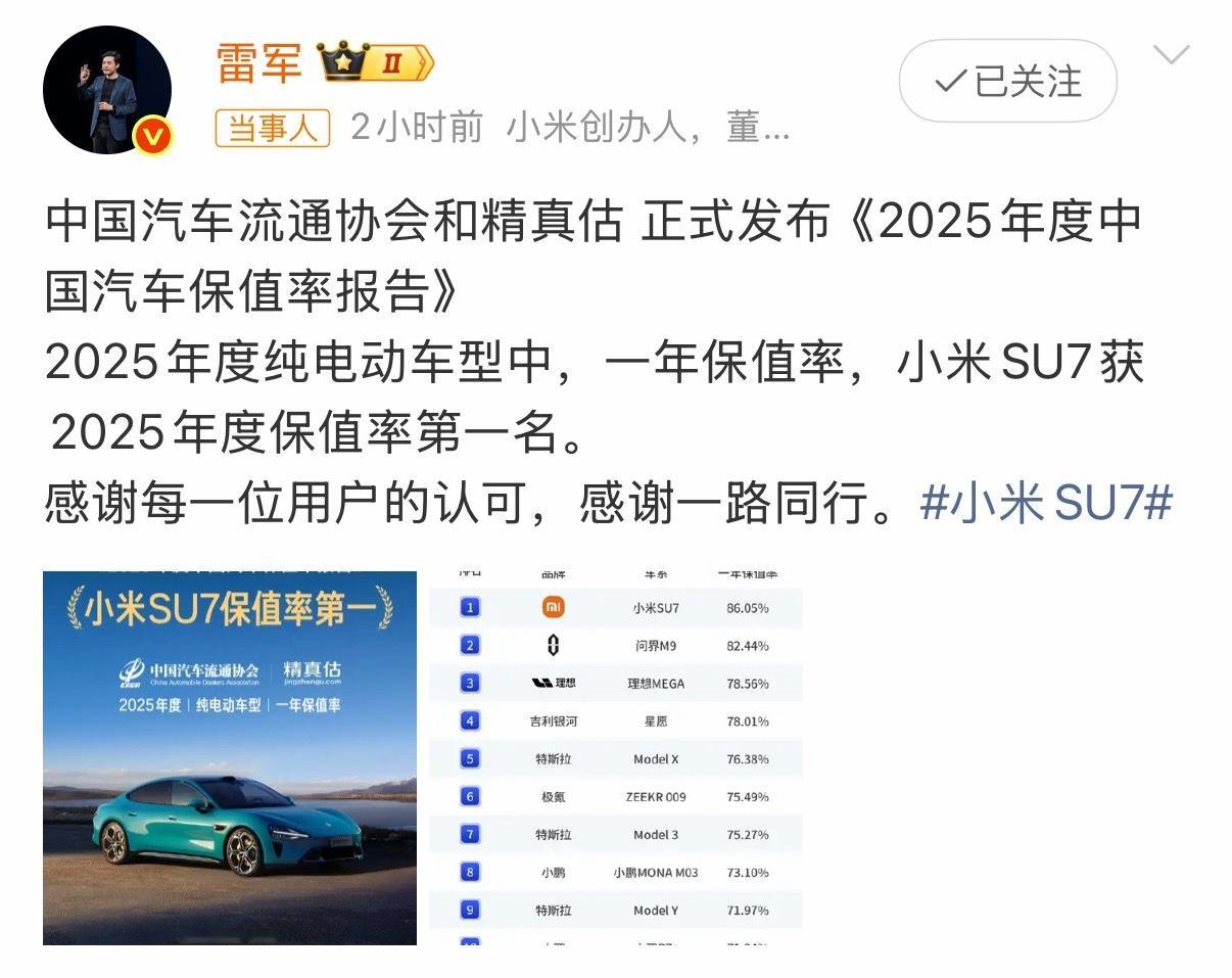小米SU7拿下一年保值率第一,说到底还是卖得好、热度高、二手好出手。对那些怕电车掉价的人来说,这个成绩确实比参数更有说服力。雷军回应小米SU7保值率第一名