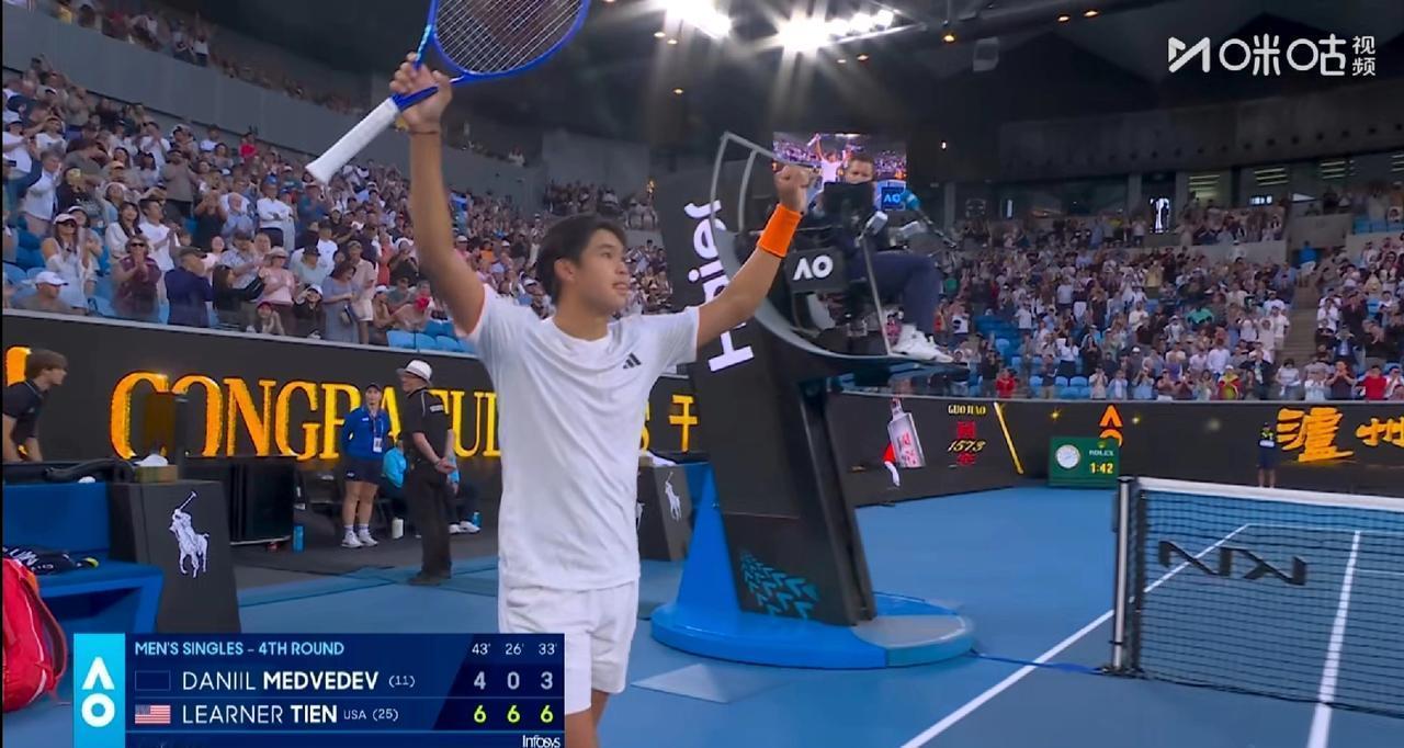 1小时42分钟,吞下一个0-6。梅德韦杰夫在澳网的崩盘,不是意外,是一场蓄谋已久的“处决”。 这串冰冷的数字背后,不是状态的起伏,而是权力的交接。4-6,0-6,3-6。这不是一场势均力敌的对抗,这是一次教科书般的拆解。 那个叫勒纳·钱的05后美国小子,已经是第四次和梅总交手,这已是他拿下的第三场胜利。 他不是黑马,他是天敌。 想象一下那个窒息的画面:从第一盘末段开始,梅德韦杰夫就像被瞬间拔掉了电源。 连续丢局,眼神涣散,那个曾经能把任何对手拖入深海的“章鱼”,这一次,自己先溺水了。 你眼睁睁看着他所有的武器——底线相持、不讲理的防守、刁钻的发球——被一个更年轻、更凶狠的左手将一一破解、碾碎。 你必须承认,29岁的梅总,刚刚才捧起生涯第22冠,身体里还有油。 但他撞上的,是一堵名叫“时间”的墙。 墙的另一边,是整整年轻9岁的身体,是盯着他研究了无数遍录像的饥饿眼神,是专为克制他而生的打法。 网球世界最残酷的真相,从来不是一次爆冷出局,而是让你亲眼看着,你的时代,被一个更年轻的你,一拍一拍地夺走。