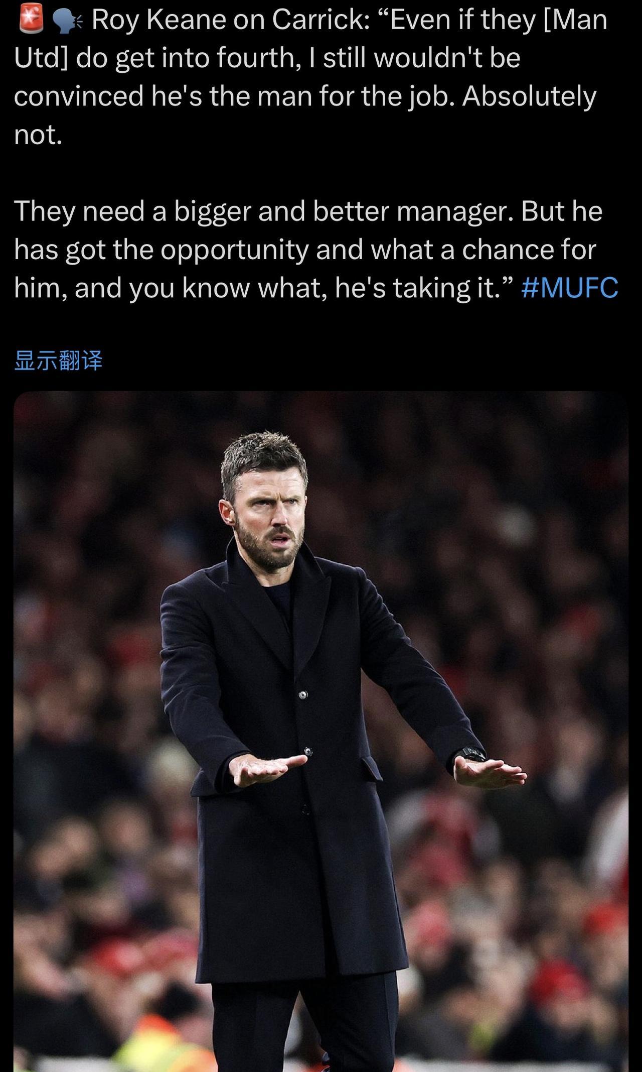 赢了曼城阿森纳就够了? 罗伊·基恩一句话,戳破了曼联最大的“临时主帅”幻想。 他直言,就算卡里克带队冲进前四,也别转正。 曼联需要的不是一个“气氛组”组长,而是一个能掰手腕、抢冠军的狠角色。 这套剧本,曼联球迷太熟了。 索尔斯克亚的“转正陷阱”就是前车之鉴。 短期打鸡血,球员跑动积极了,防守硬朗了,然后呢? 高层赌博式地扶正一个“自己人”,最终换来的只是又一次推倒重来。 记住,豪门的标准从来不是“感觉良好”,而是把奖杯刻上自己的名字。