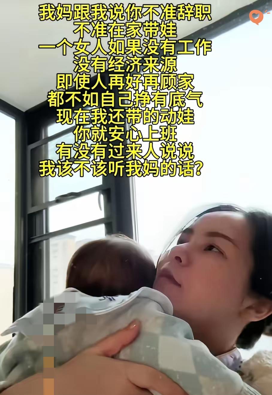 听人劝吃饱饭, 听亲妈劝那是保命! 女子生完娃想辞职带娃, 亲妈却当头棒喝: “不准辞!有我带娃你就去上班,自己挣钱才是最大的底气!” 这话虽然听着硬, 但全是过来人的血泪经验。 现实太残酷, 全职带娃18年却被社会抛弃、伸手要钱看脸色的例子比比皆是, 婚姻再稳固也不如卡里的余额让人安心。 工作不仅是钱, 更是你不被生活裹挟的铠甲, 是你保持独立人格的底气。 千万别为了一时的安逸, 赌上后半辈子的尊严。 你觉得女子该听妈妈的话吗?带娃情感语录