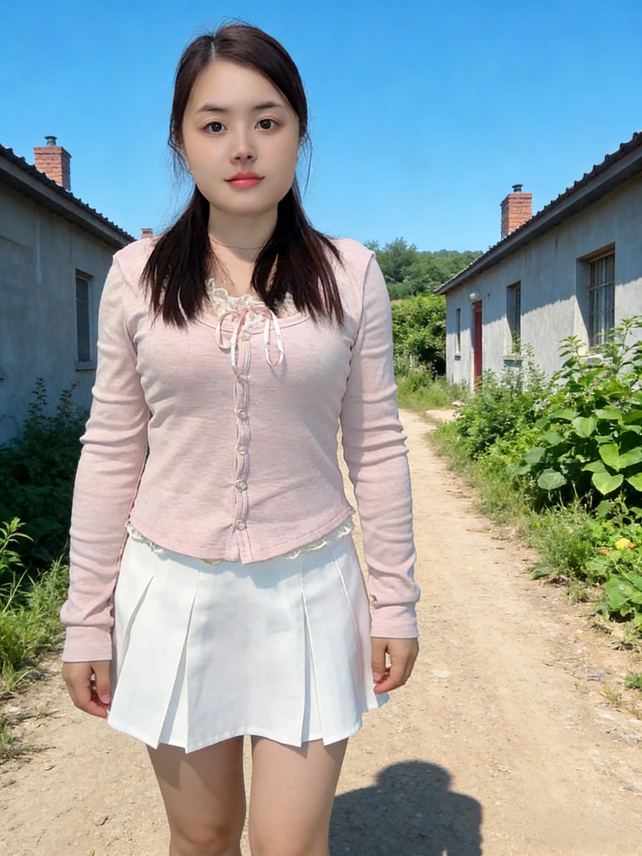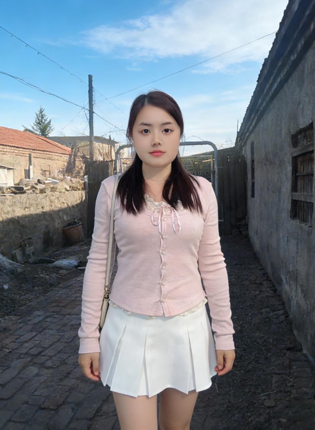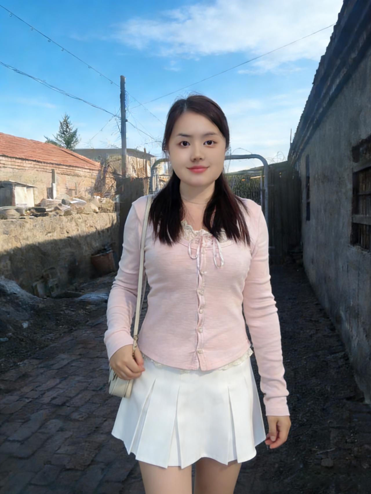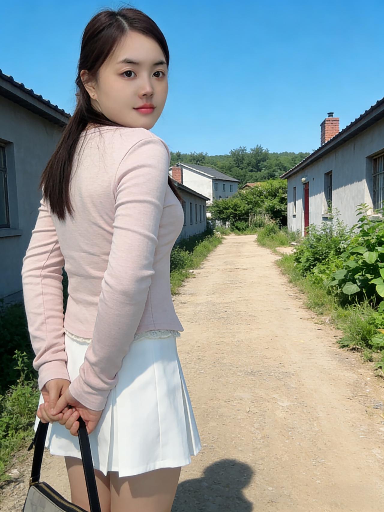 镜头定格时,她倚着红砖墙 粉衫白裙,在灰扑扑的乡村背景里 像一朵刚绽的蔷薇,撞碎了夏日的单调 阳光斜切下来,在她发梢镀上金边 睫毛轻颤,落着乡村的细碎光影 ~ 旧木门的铁网,在她身后织成暗纹 她的侧脸,映着青石的凉,像水墨画里的留白 手指蜷在身侧,握着一缕夏日的风 风里有麦香,有蝉鸣,有青草的涩 ~ 转身走向土路,裙摆扫过草叶 惊起的露珠,滚落在泥土里,悄无声息 她的脚步,轻得像云朵掠过屋顶 红砖烟囱的烟,慢悠悠飘向蓝空 与她的身影,在夏日的画布上相融 ~ 坐在草垛旁,她低头拨弄草茎 发帘垂下来,遮住半张脸,只剩嘴角的笑 像藏在麦穗里的甜,被夏日的阳光晒透 远处的白屋,红瓦,在她身后缩成剪影 ~ 她是乡村夏日里,最生动的那笔色彩 比野花开得热烈,比溪水淌得温柔 蝉声歇了又起,她的身影在巷里晃 像一粒投入湖面的石子,漾开乡村的静 ~ 时光在她的眼眸里,成了慢放的镜头 每一个瞬间,都裹着夏日乡村的温软 她是肖像里的魂,是乡村夏日的心跳 在蓝空下,在泥土上,在风里,鲜活又绵长