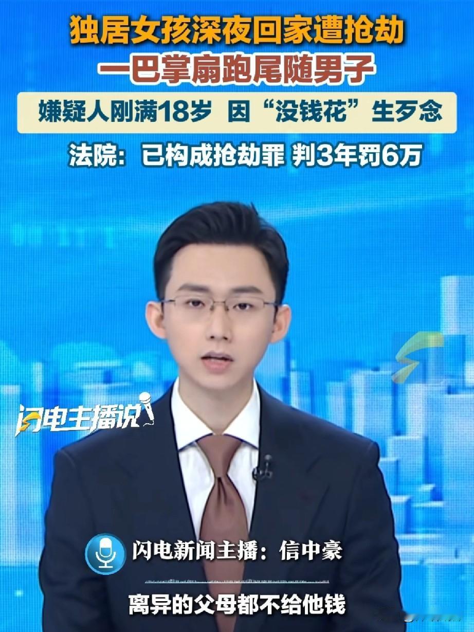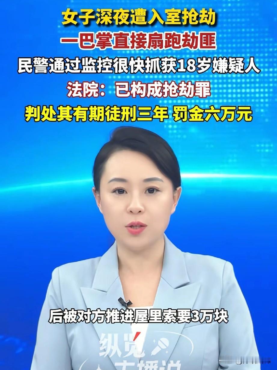 18岁男子深夜欲抢劫3万元,却被独居女子一巴掌扇过来,男子破荒而逃。男子没捞到1分钱,却被判处有期徒刑三年,罚金6万元。 据“闪电新闻”1月26日报道,北京顺义区人民法院审理了一起入室抢劫案。 深夜11点,北京的年轻女孩小李下了班回家,一路上虽然有名良的灯光,但毕竟是她独自一个人,她还是挺紧张的。她步履匆匆,丝毫没有注意到身后有个女子若隐若现的跟着她。 到了公寓楼下,小李等电梯的时候,一个年轻男子走过来也等电梯,这时候小李并没有多想。两人一块进了电梯后,男子赶在小李之前下了电梯。 小李终于走到了自己家门口,掏出钥匙准备开门,就在房门打开的一刹那,那个和她同乘电梯的男子突然出现,一下子抓住了小李的后衣领和脖颈。 小李大惊失色,问男子要干什么,男子一边把小李推到卧室,一边说要小李拿3万块钱给他。 小李懵逼了,大脑瞬间快速思考,这个男子手上的力量并不大,要钱时候的语气也没有特别凶狠,身体也不是特别强壮。 小李判断,这个男子只是来求财的,不会伤害她。 于是,小李浑身的力量突然爆发,她一巴掌狠狠的甩在男子脸上,叫她滚。 男子根本没想到小李会有这样的反应。一个独居女子,在面对危险的时候,正常不应该束手就擒乖乖拿钱出来吗?电影电视里可都是这样演的,怎么前的这个女人有这样出其不意的一招呢? 男子被这一巴掌吓坏了,他不知道接下来还会发生什么,女子是不是有更厉害的拳脚功夫。在无法做出判断时,他只能退而求其次,走为上策。 男子离开后,小李第一时间拨打了报警电话。帽子叔叔在调取了小区周边的监控以及楼道内的公共视频以后,很快将犯罪嫌疑人张某抓获。 说起来,这个张某也是个可怜人,事发时他刚满18岁。他的爸爸妈妈早就离婚了,张某一个人生活,爸爸妈妈都有了各自的家庭后,很少关心他。他平常都是靠自己打工维持生计。 但是张某并没有珍惜自己辛辛苦苦赚来的劳动报酬,而是大部分用来吃喝玩乐了。大手大脚习惯了以后就收不住了,没到发工资就没去买饭了。 张某手头紧,不是想着节省点花,也不是想着给朋友同事借一点,而是铤而走险,把目光瞄向了一个独居女人,在深夜时尾随她回家,以为能赚到3万块钱。 没想到,帽子叔叔以抢劫罪对张某提起了公诉,判处他有期徒刑三年,罚金6万元。 一个刚走上社会的小伙子,他本来可以通过自己的辛勤劳动生活的很好,最起码衣食不愁。再努力一点,学个技术,几年后还能有机会妻子生子。但是一念之差走上歪路,真是得不偿失。 希望张某能深刻认识到自身错误,好好改造,早一点开启新生活。