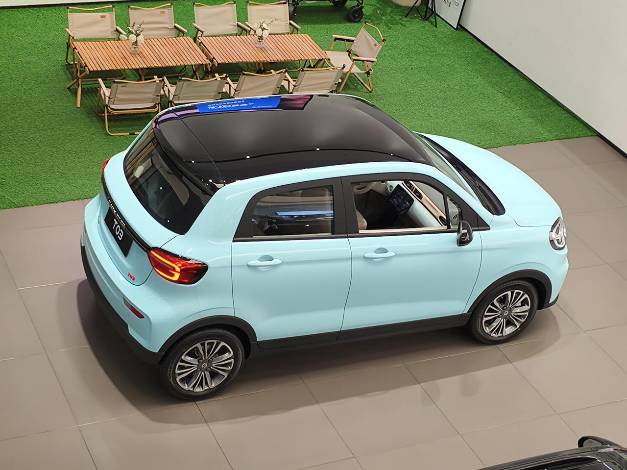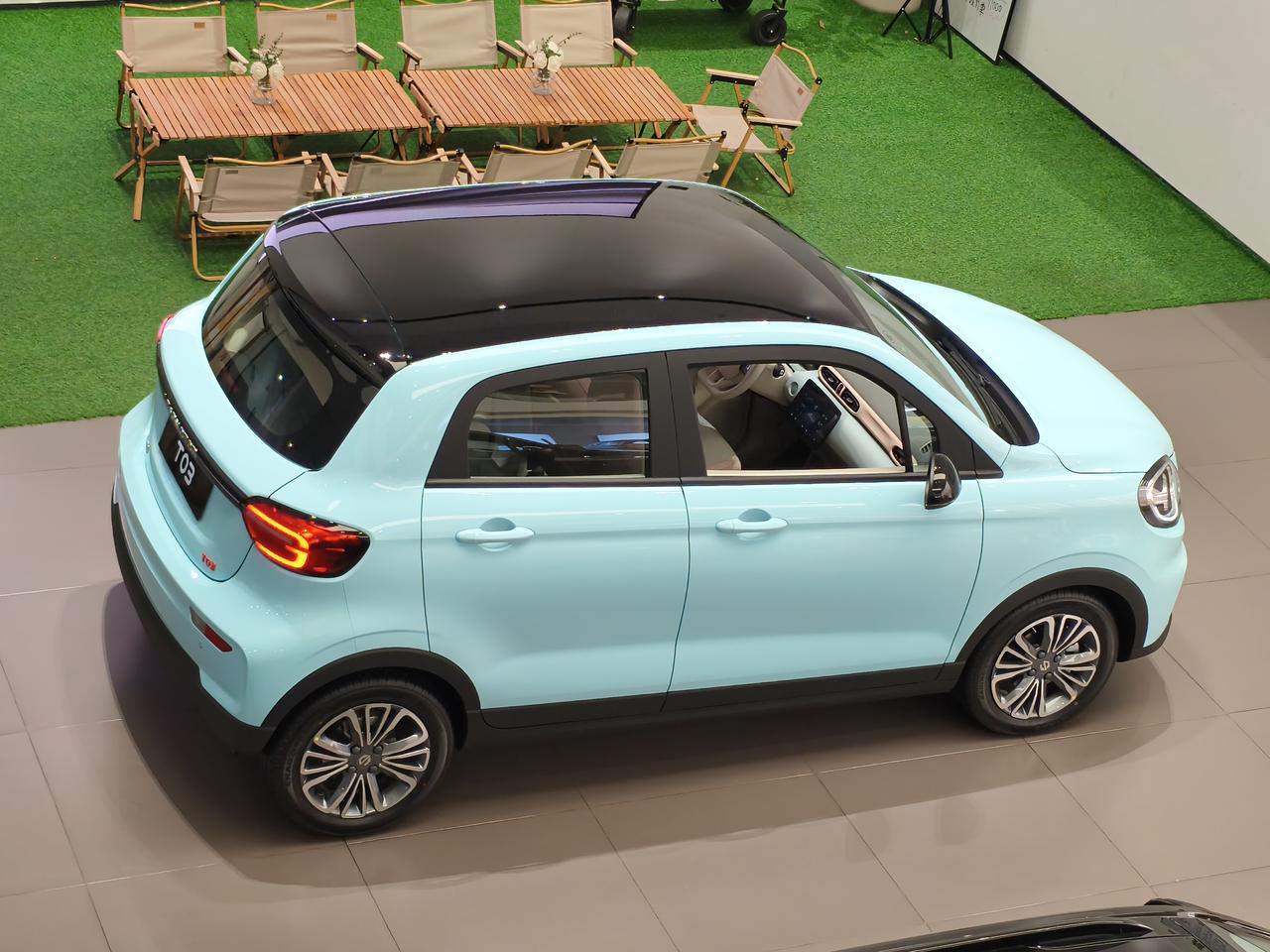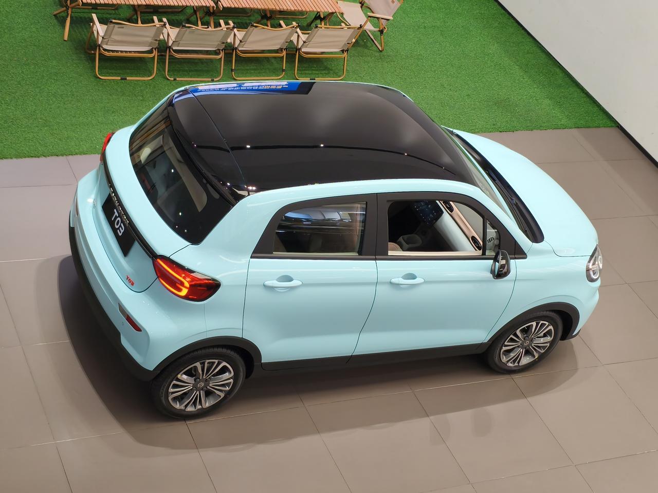 零跑T01,这个角度看还挺帅气的。 蓝色车身,全黑悬浮式车顶,外形小巧圆润,挺亮眼的。 车长3620mm,轴距2400mm,低配31.9度电池包,续航310公里,高配41.3度电池包,续航403公里,售价5.99万~6.99万,市面上大概有8千左右的优惠。 价格不贵,电池包在同级别里面,有很大优势,唯一的缺点是后排空间小了一点。 女孩子代代步可以,样子确实可爱。