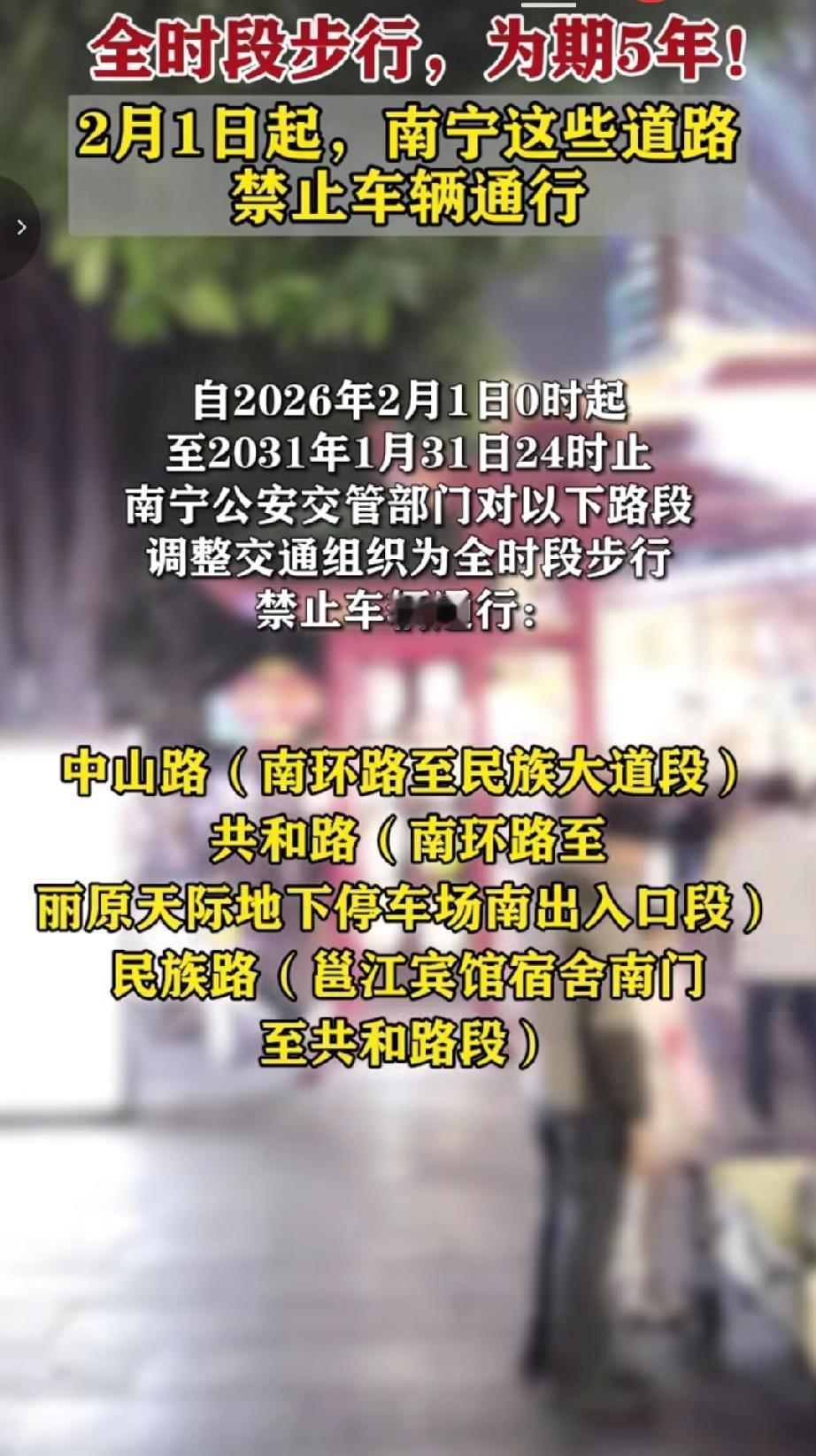 2026年2月1日0时起至2031年1月31日24时止,南宁公安交管部门对以下路段调整交通组织为全时段步行,禁止车辆通行:仁爱路(解放路至石巷口段)- 解放路(民生路至新华路段,不含解放新华路口)- 民生路(当阳街至江北大道段,含当阳民生路口)- 当阳街(三街两巷一期停车场出口至民生路段)- 中山路(南环路至民族大道段)- 共和路(南环路至丽原天际地下停车场南出入口段)- 民族路(邕江宾馆宿舍南门至共和路段)此外,上述时段内,当阳街(三街两巷一期停车场出口至民族大道段)实施由北往南单向通行交通组织措施。这一调整是为了打造邕州古城商业街区。(来源于@南国早报 )