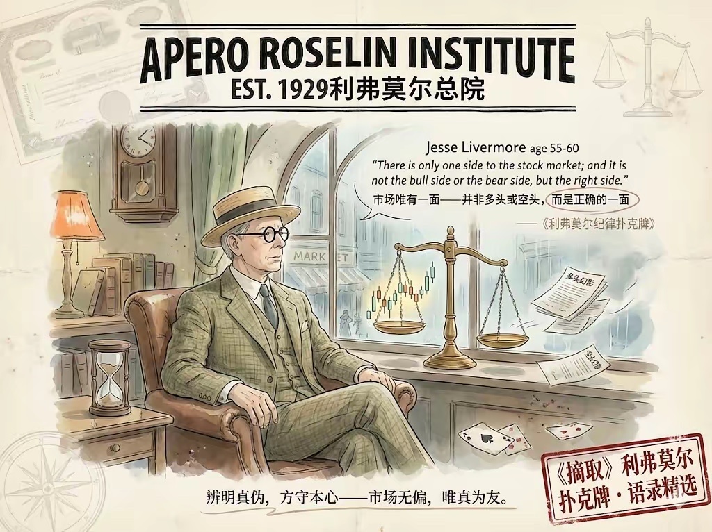 利弗莫尔说:多数人把市场当战场,分多头空头,你死我活;少数人把市场当朋友,只问对错,不问方向。市场从不偏袒任何人,它只眷顾那些能顺应它的人。正确的一面,不是你希望的方向,而是市场的方向。多头时,它告诉你买入;空头时,它告诉你卖出。顺应市场,就是顺应正确。佛家云“应无所住而生其心”,道家说“上善若水”。如老僧敲木鱼,轻重有度,节奏分明;如行舟随浪,浪起则行,浪落则停。今晚,把自选里最想动的那只票的周线图打印出来,贴在墙上。关灯,用手电筒从左到右慢慢扫过,每一根K线停留三秒,感受它的节奏。明早若趋势未变,就继续等;若趋势已变,就果断出手——让市场替你决定方向,让正确替你赚钱。——利弗莫尔扑克牌语录精选