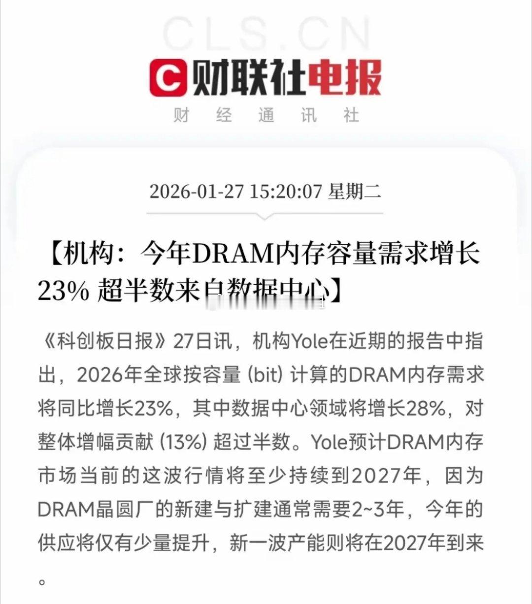 半导体芯片,大消息。今天大盘收盘后,半导体芯片利好来了,怪不得今天,芯片这么强势,原来盘后有利好,这利好总喜欢盘后出。半导体芯片,盘后又有利好。机构Yole在报告中说,今年DRAM内存容量需求增长23%,数据中心增长28%。还说行情,将持续到2027年。这无疑就是对半导体芯片,又是利好!