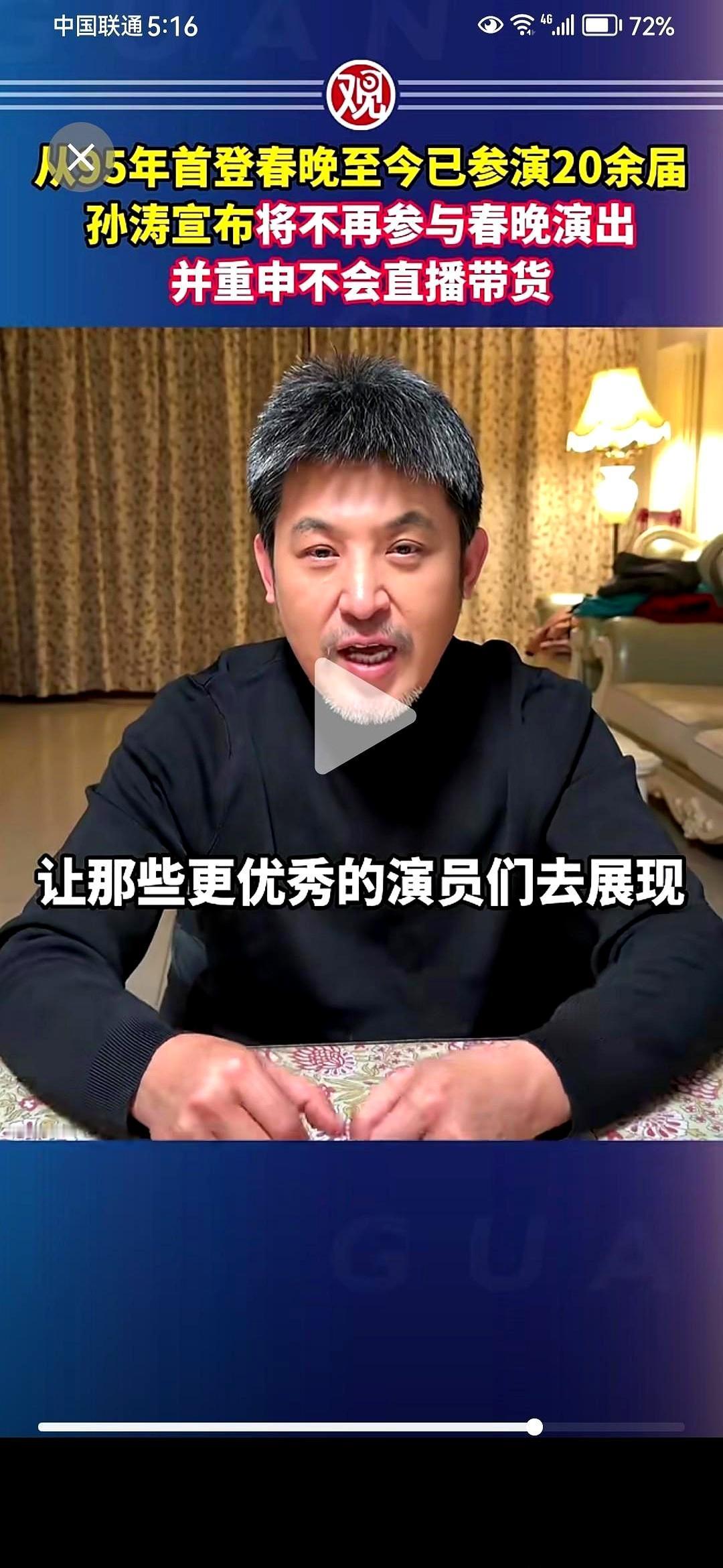 孙涛彻底不忍了!顶着一脸胡茬,宣布三件事:退出春晚,不直播,不带货。而闫学晶那边,正端着粘豆包笑呢。 你去看孙涛那个视频,脸都没刮,穿着老头衫,眼睛里全是疲惫。直接就跟你说,春晚不上了,直播不干了,小黄车也给我关了。为啥?就因为那些AI造谣的视频,硬说他“力挺”闫学晶,把他给恶心坏了。 你再看同一天的闫学晶,那叫一个喜庆。穿着小花棉袄,一群小姐姐围着,端着热气腾腾的粘豆包,一口一个腊八节快乐。满面红光,跟孙涛这边的愁云惨淡,简直是两个世界。你说巧不巧,俩人都是春晚老搭档,偏偏在同一天,一个被谣言逼到告别舞台,一个在镜头前岁月静好。 真正的艺人,不是看他在流量风口上捞了多少金,而是看他在谣言污水里,还剩多少风骨。
