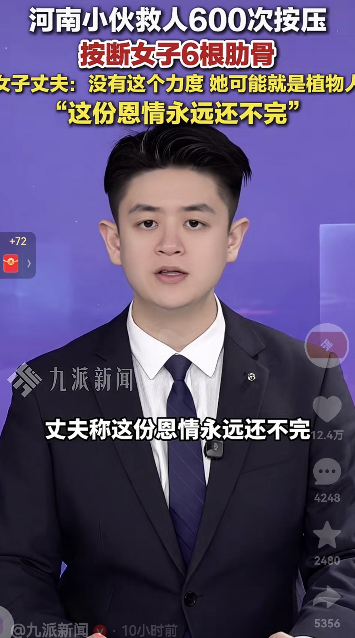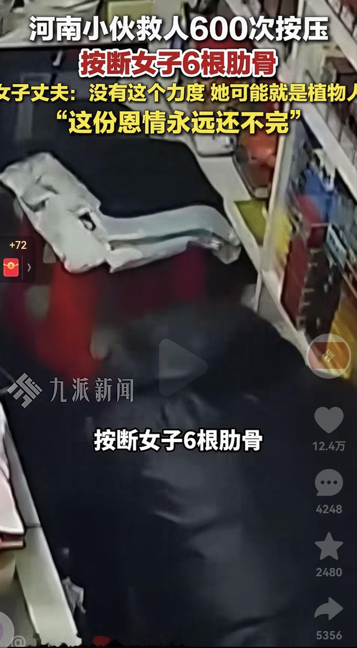看的人心里暖暖的!这一幕真的太美好了!去年年底,在江苏苏州的一家小超市里,河南小伙张晓国正结账,老板娘笑着给他免了1块钱的零头。 就因为这一句客气话,两人多聊了两句,谁也没想到,下一秒老板娘就突然眼前一黑,一头栽倒在地,没了呼吸。 张晓国注意到了这个情况,来不及思考,立刻冲上去跪地救人,同时第一时间拨打了120。 电话那头,急救中心的调度员在那头隔空指导他:“仔细听好,我现在教你怎么做胸外按压,我们要坚持做600次,要一直做到急救医生接手。” 他虽然没有经验,他还是咬着牙跟着节奏数:“1234、1234……”一下、两下、三下……他整整按压了600次,按到自己胳膊都在抖,按到最后把老板娘的6根肋骨都按断了,可他一秒都没停。 600次胸外按压过后,老板娘还没有呼吸,这个时候小伙就开始穿插着做人工呼吸,直到急救人员赶到。 经抢救,老板娘最终转危为安,没有落下后遗症。 事后医生说,要是没有这个力度,老板娘很可能就成了植物人,甚至连命都保不住。 面对妻子被按断的6根肋骨,老板娘的丈夫没有丝毫抱怨,只有庆幸和感恩,他红着眼说:“如果肋骨不摁断的话,基本上讲就是植物人了,达不到那个效果嘛。这份恩情,我们永远还不完。” 网友看到后评论说:“这才叫真爷们!600次按压,胳膊都抖了还不停,这不是一般人能做到的!” 还有的网友说:“现在很多人都怕救人被讹,可他连想都没想就冲上去了,这才是骨子里的善良。” 河南小伙这600次的按压,按断的是肋骨,救活的却是一条小伙的生命。 而老板娘丈夫的一句“恩情永远还不完”,也让我们看到了善良与善良的双向奔赴。 我们总说“好人有好报”,可真正的好人,从来不是为了回报才出手。就像张晓国,他只是做了他觉得该做的事,却没想到这一按,不仅救了一条命,也暖了无数人的心。 对此,你有什么看法呢?欢迎大家评论区讨论留言。