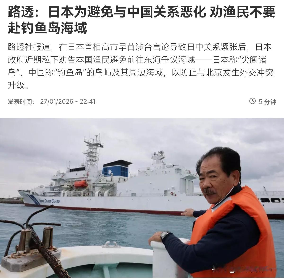 日本害怕了!在钓鱼岛问题上,日本往后撤了!1月28日,根据路透社报道,外媒表示,日本政府立场出现明显转变。多年来,日本政府对部分渔民前往钓鱼岛海域捕鱼采取默许态度,这些活动被一些日本渔民视为彰显日本对相关岛屿及周边海域实际控制的一种方式。但是,自高市早苗上台,中日关系恶化以来,多名日本官员私下劝告日本渔民避免再前往该地区。 石垣市市长中山义隆表示,在日中关系紧张加剧的情况下,日本官员担心渔民可能遭到中国当局扣留或检查。如果真的有人被扣留,可能升级为更大规模的国际事件,我认为这是政府希望避免的。这可能引发与中国海警船更严重的对峙,导致局势迅速升温。很显然,从日本这一动作来看,这说明什么呢?这明显说明日本害怕中日紧张局势继续升温,因此,开始做内部管理了。 更深层的来看,其一,这说明日本对美日同盟根本就没有信心。此前美国曾多次表示,美日安保同盟适用于钓鱼岛。如果美国真的是力挺日本,日本会往后撤吗?这根本不可能。这说明日本其实也清楚,如果日本真要是挑事,以现在的状况,那后果也只能是日本担着,美国根本指望不上。 其二,这说明日本对我们的实力心存畏惧。因为如果日本激化矛盾,弄不好我们会彻底实控钓鱼岛,这些动作包括登岛,拆除岛上建筑物等等。而一旦局势往那个方向发展,日本根本没有跟我们叫板的实力。而高市早苗政府可能会不得不因此承担“失去”钓鱼岛的责任,这必定将重挫其威望。现在我们海警船连续不间断的携带机炮航航钓鱼岛海域,无疑,主权问题,我们寸步都不会让。