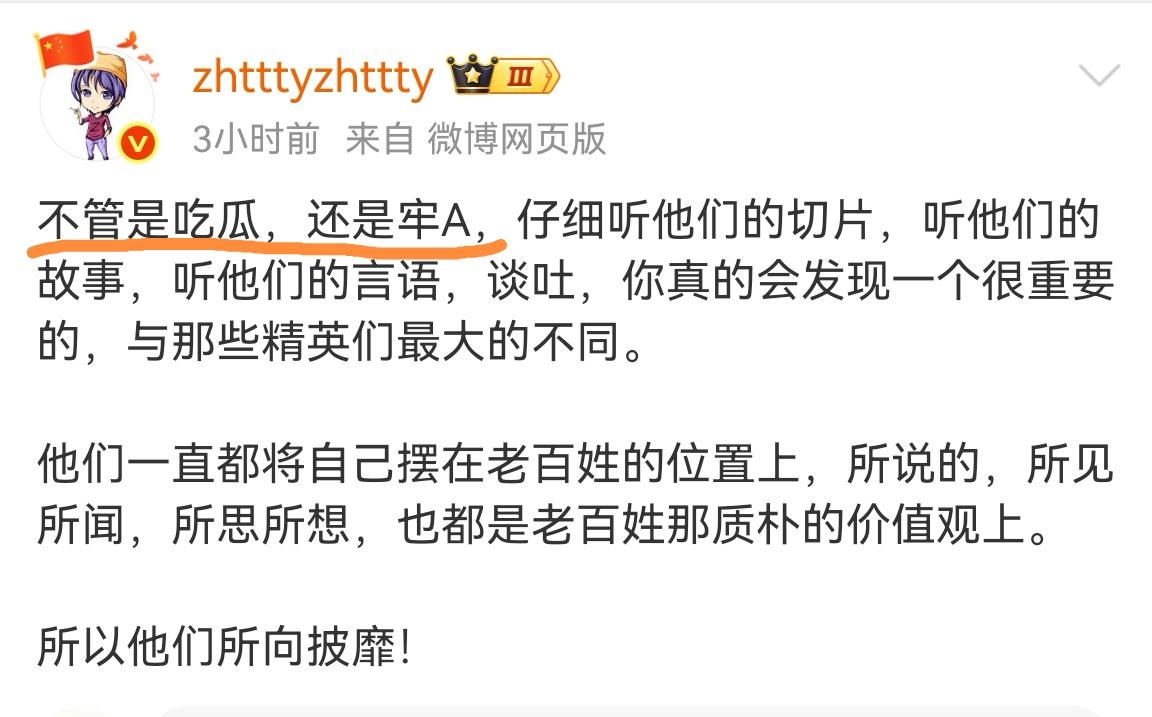 看了几位大佬分析吃瓜、牢A为什么会这么牛的原因。让我更加担心当初围攻吃瓜的人和以后将围攻牢a的人,将会是同一批人。 正如大佬所说,这两个人的共同特点就是一直把自己摆在老百姓的角度上位置上,从老百姓的质朴情感去拨开历史迷雾,可谓是众生平等的火力全开… 所以那群所谓高高在上的“精英们”不敢在专业上与他们下场对线,只能对人不断抹黑。 于是他们就围在四周,苦苦等待寻找制造能够围攻机会。 我们就静静的观察,到时候会不会还是“通古斯”博主齐下场,就让时间给出答案。