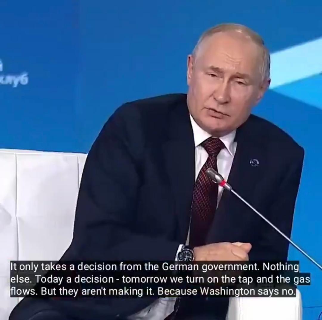 普京的这个观点欧盟肯定是听不进去的!普京:“北溪2号管道还剩下一根管道,它没有损坏,可以输送27.5万亿立方米的天然气。 德国政府今天只需做出一个决定,明天我们就能打开水龙头,但他们迟迟不肯行动,因为华盛顿方面说不。” 普京这番话算是把欧盟的遮羞布直接扯下来了,明摆着给了台阶,可欧盟偏要硬扛,说到底还是胳膊拧不过大腿,被华盛顿死死攥着能源命脉。 北溪2号那根完好的管道,就像根刺扎在欧盟心头,明明能立刻打开天然气阀门缓解困局,却只能眼睁睁看着它闲置,核心原因哪儿是什么安全顾虑,全是美国在背后指手画脚。 要知道这根管道可不是摆设,俄能源部门早明确过项目从经济和技术层面都已完工,具备随时供气能力,27.5万亿立方米的输气量足够帮欧洲扛过好几轮能源危机,可德国政府连点头的勇气都没有,毕竟美国的态度比本国民生和经济还重要。 俄乌冲突后,对俄制裁成了欧盟内部的政治正确,仿佛不跟着表态就不合群,却没料到把自己逼进了死胡同。 原本欧洲依赖的俄罗斯管道天然气,便宜又稳定,德国工业的蓬勃发展多年来都靠着这份低成本能源红利,可如今为了迎合政治正确,硬生生切断了这条命脉,转头投入美国的怀抱。 可美国哪里是来救急的,分明是趁火打劫,法国总统马克龙都忍不住公开吐槽,美国卖给欧洲的液化天然气,价格比自家本土贵了三倍还多,一艘LNG运输船从美国出发,到欧洲一转手就能净赚超过1.5亿美元,这哪里是盟友互助,简直是把欧洲当成了提款机。 欧盟这番操作苦的还是自己,经济和民生双双承压,好日子一去不复返。 德国作为欧洲经济引擎,受影响最为惨重,能源密集型产业集体哀嚎,化工巨头巴斯夫因为能源成本飙升,不得不缩减欧洲产能。 甚至计划把业务转移到能源更便宜的国家,要知道巴斯夫的生产基地可是德国工业的标杆,连它都扛不住,足以见得能源价格暴涨的杀伤力。 不止大企业,德国的中小型企业也日子难熬,近四分之一的中型企业都在考虑转移生产阵地,这些支撑德国经济的中坚力量,如今却被高能源成本逼得背井离乡。 普通民众更是怨声载道,电价较之前翻了近三倍,取暖、做饭成本飙升,生活压力陡增,而政府推出的能源补贴,在持续高企的能源价格面前不过是杯水车薪。 美国为了把欧洲绑在自己的能源战车上,早就对北溪项目动了歪心思,从特朗普政府到拜登政府,一直用制裁大棒打压北溪2号,还把这个纯商业项目扣上地缘政治的帽子,本质上就是怕俄罗斯天然气抢占美国页岩气的市场。 更讽刺的是,美国一边阻挠欧洲用便宜的俄气,一边通过《通胀削减法案》抛出巨额补贴,吸引欧洲企业赴美投资,之前计划在德国建超级工厂的瑞典电池企业,就因为美国给的补贴是德国的四倍,转头就优先考虑美国市场,这波釜底抽薪让欧洲雪上加霜。 欧盟不是不清楚其中的猫腻,可在政治捆绑下只能硬吞苦果,明明有北溪2号这个最优解,却因为美国的反对而不敢触碰,所谓的欧洲能源主权,不过是依附于美国的附属品。 这种明知被收割却无力反抗的窘境,恰恰印证了普京讲话的犀利,也暴露了欧盟在大国博弈中身不由己的被动地位,终究是为自己的政治正确买了单。