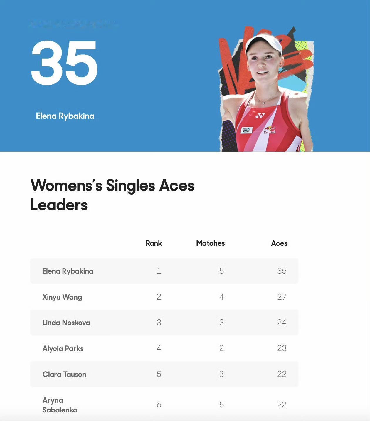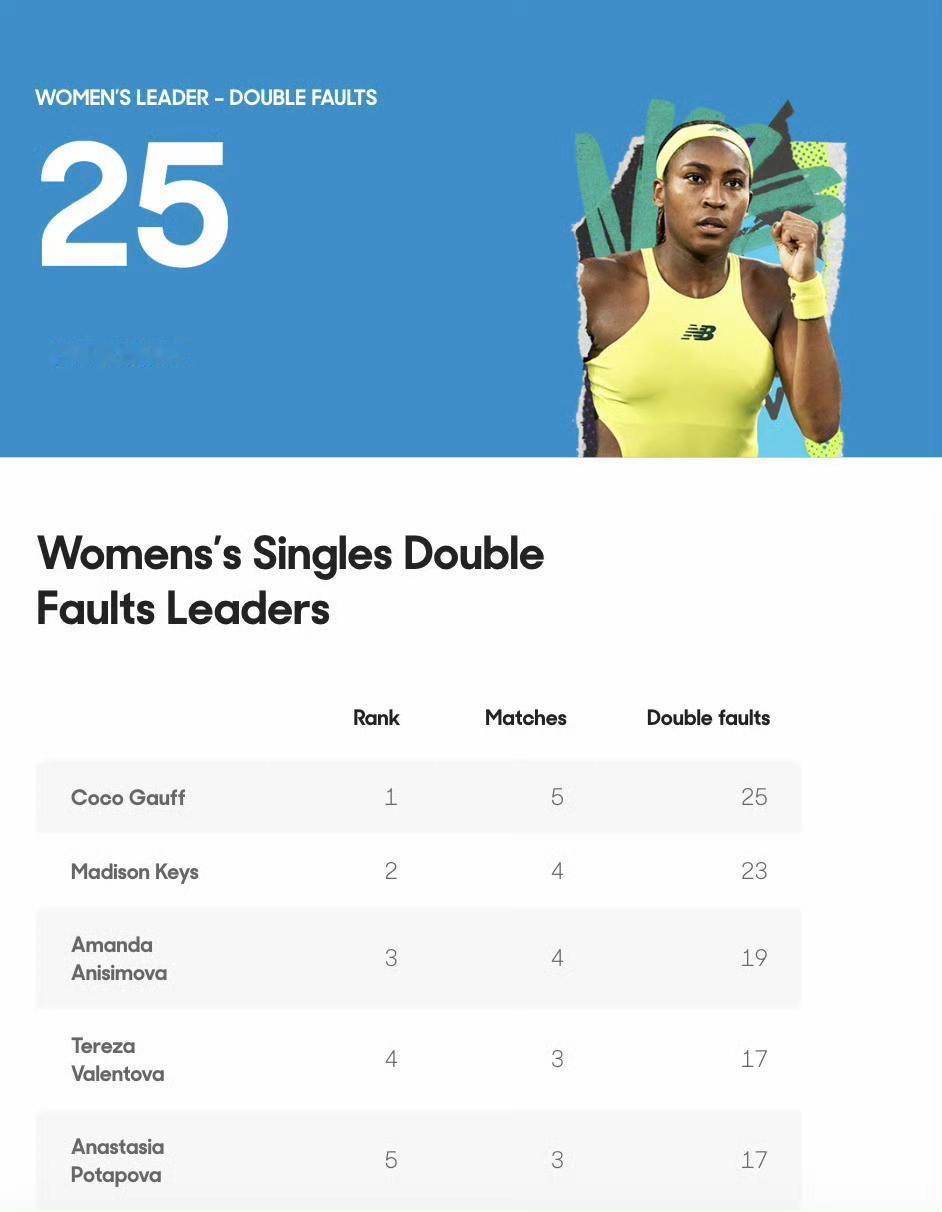 莱巴金娜今天发了11ACE球,很轻松地以2-0淘汰斯瓦泰克,此前ACE榜首是中国金花王欣瑜;阿尼西莫娃今天打出8个双误,一举反超高芙位列榜首,两人被淘汰太正常了。 莱巴金娜7-5/6-1斯瓦泰克 佩古拉6-2/7-6(1)阿尼西莫娃 高芙1-6/2-6斯维托丽娜
