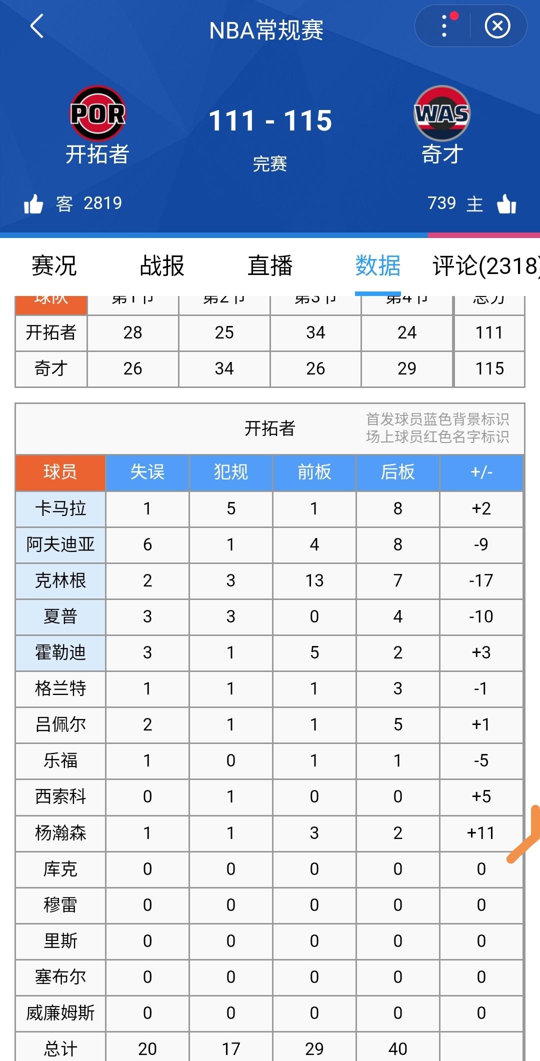 开拓者输了,杨瀚森没输!开拓者111-115不敌奇才,无奈接受三连败。 杨瀚森替补登场12分钟,以6分5篮板1助攻的高效表现创下个人NBA生涯单场最高正负值(+11),成为全队攻防效率最突出的球员。
