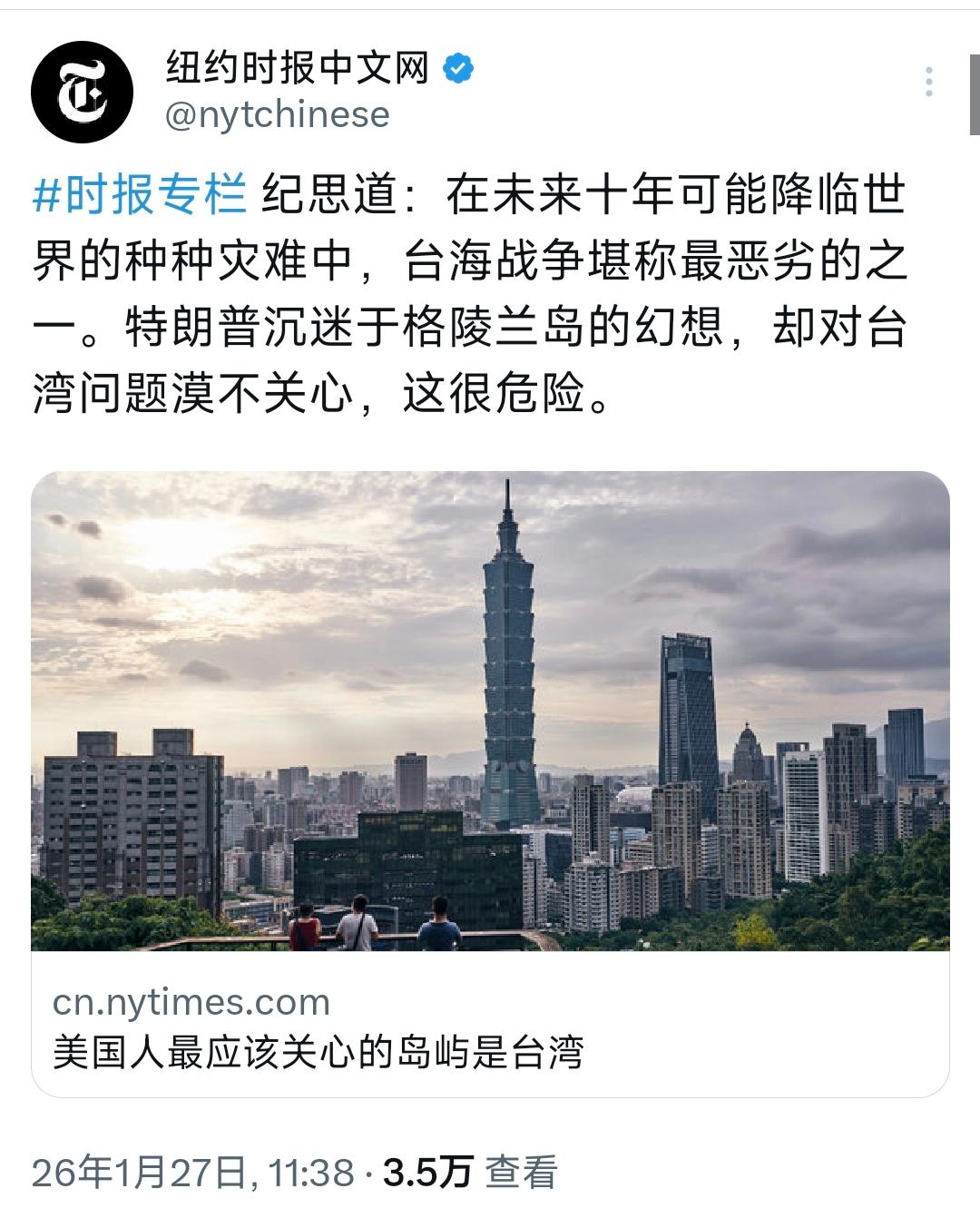 纪思道这话说反了!最近,纽约时报中文网发表纪思道的评论:“在未来十年可能降临世界的种种灾难中,台海战争堪称最恶劣的之一。特朗普沉迷于格陵兰岛的幻想,却对台湾问题漠不关心,这很危险。” 说白了,这论调简直是颠倒黑白,把台海紧张的病根安错了地方,危险从不是特朗普的 “漠不关心”,而是美国政客对台海的 “瞎关心”! 说实话,纪思道盯着特朗普 “漠不关心” 说事,却避重就轻不谈核心。美国对台政策的问题,从来不是 “不关心”,而是 “关心错了地方”。美国关心的是怎么靠对台军售赚钞票,关心怎么把台湾绑上遏华战车,关心怎么用 “战略模糊” 搅乱局势。就像之前台当局炒作 “空袭福建”,背后哪少得了美国的武器支持和舆论纵容?纪思道自己都报道过这事儿,现在却把锅甩给 “漠不关心”,这逻辑完全就是在胡闹。 而要是美国真能彻底 “不关心” 台海,反而是和平的好事。可现实是,美国一边喊着 “维持现状”,一边往台湾塞武器、派政客窜访,不断触碰一个中国原则红线。这好比有人总在你家门口晃悠,手里还拿着刀说 “我只是路过”,大陆的反制措施越来越硬,正是被这种 “伪关心” 逼出来的,纪思道却倒打一耙,完全是在胡扯。 而这对普通人来说,危险早就藏在日常里了,台湾民众怕战事影响生计,大陆东南沿海的百姓也得应对局势紧张带来的不确定性;美国普通人看似离得远,但真爆发冲突,油价涨、物价高的苦果还得他们吞。之前佩洛西窜台后,两岸航班减少、贸易摩擦升温,多少做两岸生意的小老板愁得睡不着觉,这都是美国 “关心” 出来的乱子。 要清楚,历史上这种 “拉偏架式关心” 从来没好结果。当年美国插手越南战争,打着 “自由” 旗号把人家炸成废墟;干预中东事务,结果搞得当地民不聊生。台海问题比这些地方复杂百倍,美国政客连台湾防务预算占 GDP 比例低、能源 98% 靠进口的实情都不顾,只顾着喊口号,这不就是把台湾往火坑里推?纪思道自己都承认台湾不愿为 “安全” 做重大牺牲,却还盼着美国 “关心”,简直矛盾透顶。 说真的,未来可能有几种情况:一种是美国政客继续瞎折腾,窜台、军售没完没了,“台独” 势力趁机挑事,最终逼得大陆不得不出手,纪思道担心的灾难真成现实;另一种是美国回归理性,恪守一个中国原则,停止给 “台独” 递刀,两岸在对话中管控分歧,和平统一的希望就会越来越大。但我觉得,大陆维护核心利益的决心摆在这里,不管美国是 “关心” 还是 “漠不关心”,都挡不住统一的大势,那些想靠台海谋利的政客,迟早会被历史清算。 说到底,纪思道的评论找错了靶子,台海最大的危险是美国的 “恶意关心”,是 “台独” 势力的铤而走险。特朗普的荒唐不是病根,美国霸权干涉才是乱源。只要美国停手、“台独” 死心,台海就不会有战争,这才是最朴素的真相。 以上是小编个人看法,如果您也认同,麻烦点赞支持!有更好的见解也欢迎在评论区留言,方便大家一同探讨。