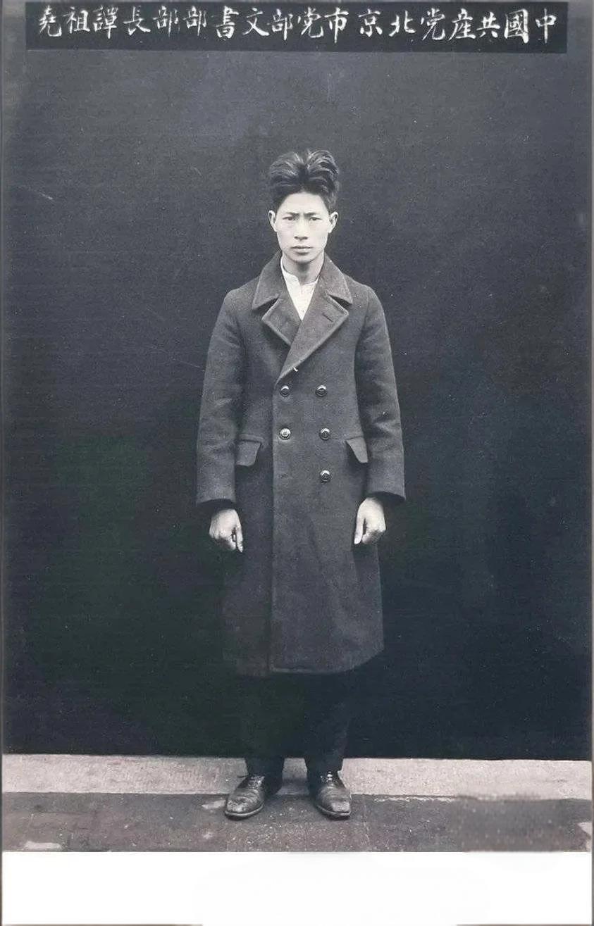 这张照片是革命烈士谭祖尧在1927年英勇就义前的最后留影,他身着一件笔挺的深色风衣,站姿挺拔如松,双手自然垂于身侧,微握的指尖透着不屈的意志。年轻的面容上没有丝毫惧色,眼神坚定地望向镜头,眉宇间满是视死如归的坚毅,仿佛在无声宣告着对革命理想的忠诚。 照片上方的题字“中国共产党北京市党部文部書部部長譚祖堯”,明确了他生前的介绍,也印证了他在革命事业中的重要地位。这张平静而刚毅的肖像,不仅定格了一位25岁青年生命的最后瞬间,更成为中国革命史上一份珍贵的精神见证,让后人永远铭记他为信仰慷慨赴死的英雄气概。