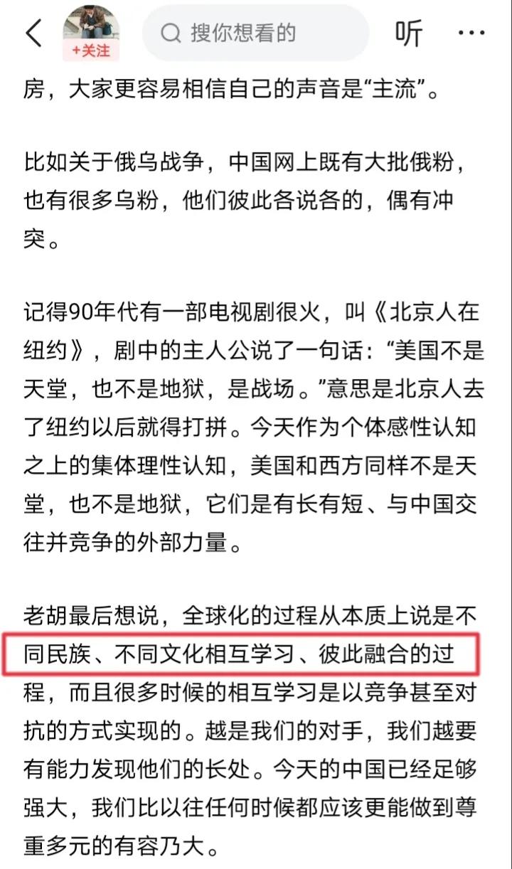 胡锡进竟然不去抨击美国的斩杀线,反而要求我们与美西方“彼此融合”,这是怎么回事呢? 原来牢A提出的“斩杀线”在全网大热之后,此前保持缄默的胡锡进终于没法不吭声了。于是老胡又开始了裹脚布般的废话连篇。 胡锡进通篇没对斩杀线做具体批判,反而表示“我们要看到美西方在法治和人文领域的许多优点”,老胡声称“我们要继续看到并勇于肯定外部世界的许多优点”。 胡锡进作为宣传战线的一员干将,世受国恩,却从骨子里仰慕美国(老胡曾说希望生在美国)。 在我们需要胡锡进揭露美国资本主义吃人罪行的时候,需要宣传干将胡锡进冲锋陷阵的时候,老胡却一边回避对斩杀线的具体批判,一边高谈阔论美西方的许多优点,然后还要求我们与美西方“彼此融合”。 须知组织培养胡锡进一辈子,可不是让老胡满口赞扬美西方的优点,可不是让老胡拒绝批判类似斩杀线的罪行。 那么胡锡进在两军对垒之际高呼对方有很多优点、要跟对方彼此融合,老胡究竟心向哪边呢?