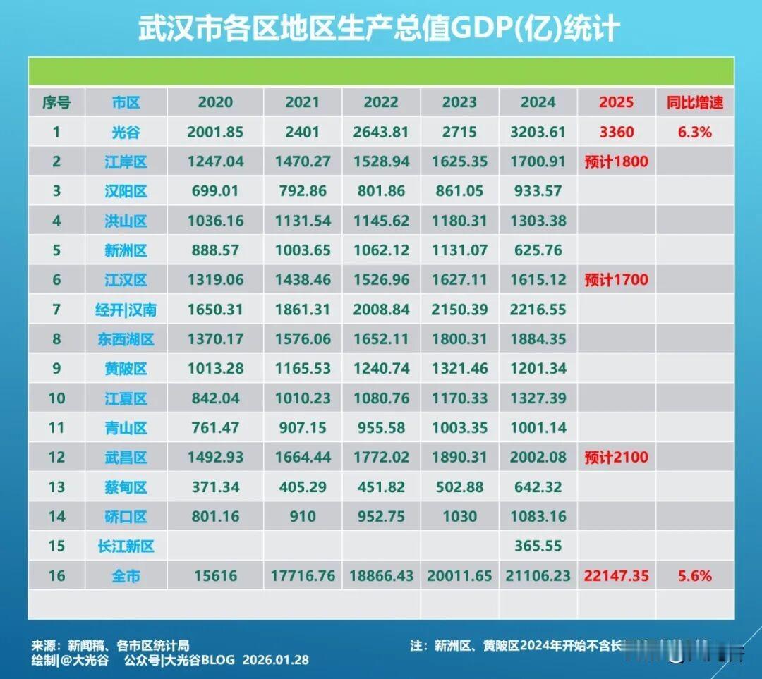 2025年武汉市GDP 22147.35亿元! 根据湖北省市州生产总值统一核算结果,初步核算,2025年,全市地区生产总值(GDP)22147.35亿元,按不变价格计算,同比增长5.6%。分产业看,第一产业增加值481.21亿元,增长3.8%;第二产业增加值6589.72亿元,增长5.0%;第三产业增加值15076.42亿元,增长5.9%。 已知,2025年光谷片区GDP实现3360亿元,同比增长6.3%。