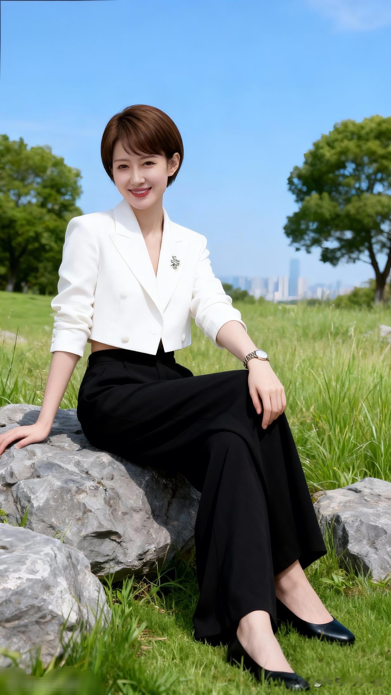 优雅职场风,黑裤白西装,都市女性魅力。有没有一种笑容让你怦然心动