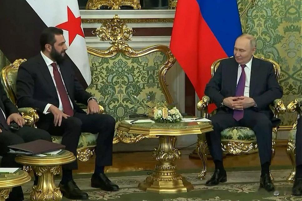 🔻听着脚趾都要抠地了! 🔻叙利亚代总统朱拉尼(艾哈迈德·沙拉)访问俄罗斯期间对普京说:“从机场出来,我看到去克里姆林宫的路上积了很多雪,这让我想到很多历史。我记得一些势力曾多次试图攻入莫斯科,但最终因俄罗斯士兵的英勇而失败,大自然也帮助你们保卫了这片土地。因此,我始终祈求上帝保佑它平安。” 🔻这些话,不知为啥总让人有种羞耻感。他说的时候,普京的表情看着也挺尴尬的。